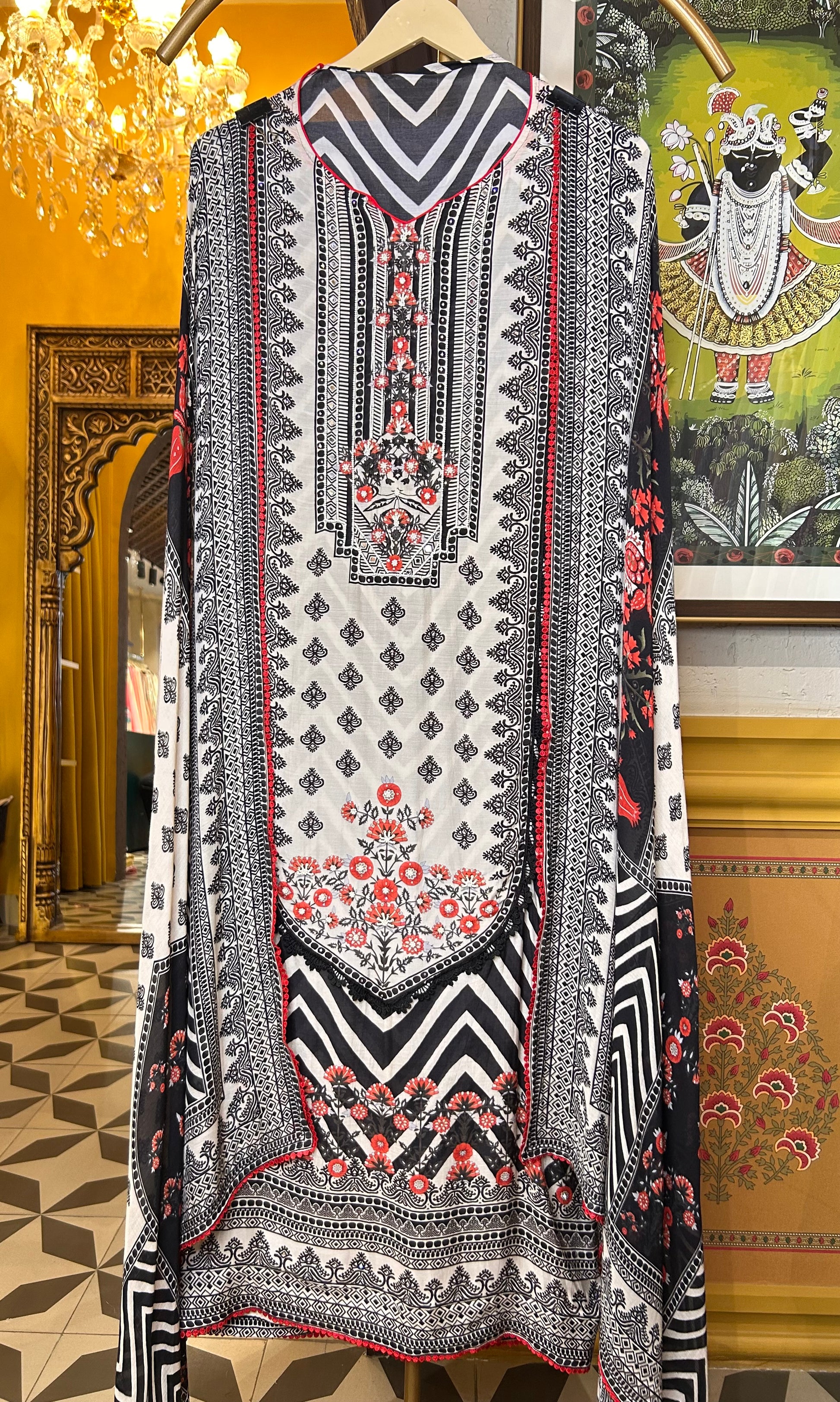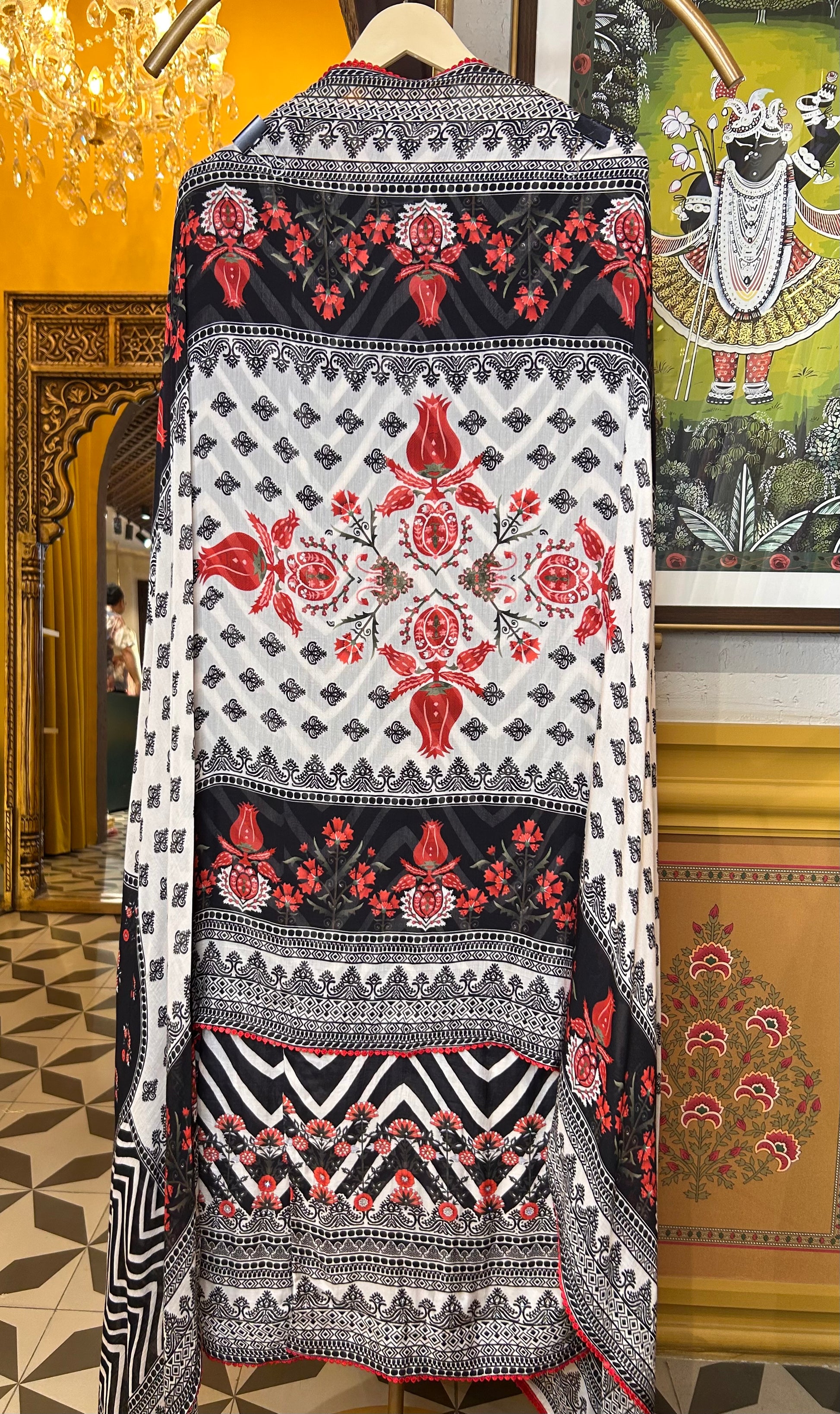 A coordinated muslin dupatta continues the digital print story — lightweight, graceful, and perfect for effortless draping. -