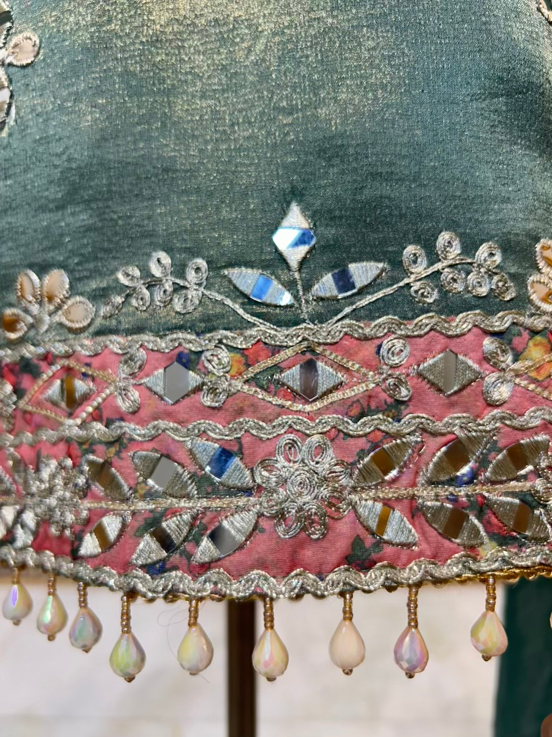 The ensemble is paired with a shimmer organza stitched gharara, detailed with coordinated dori and real mirror work, adding graceful movement and festive flair. Completing the look is a sheer organza dupatta, finished with four-side mirror, dori, and leather work—bringing depth, balance, and artisanal finesse to the silhouette.