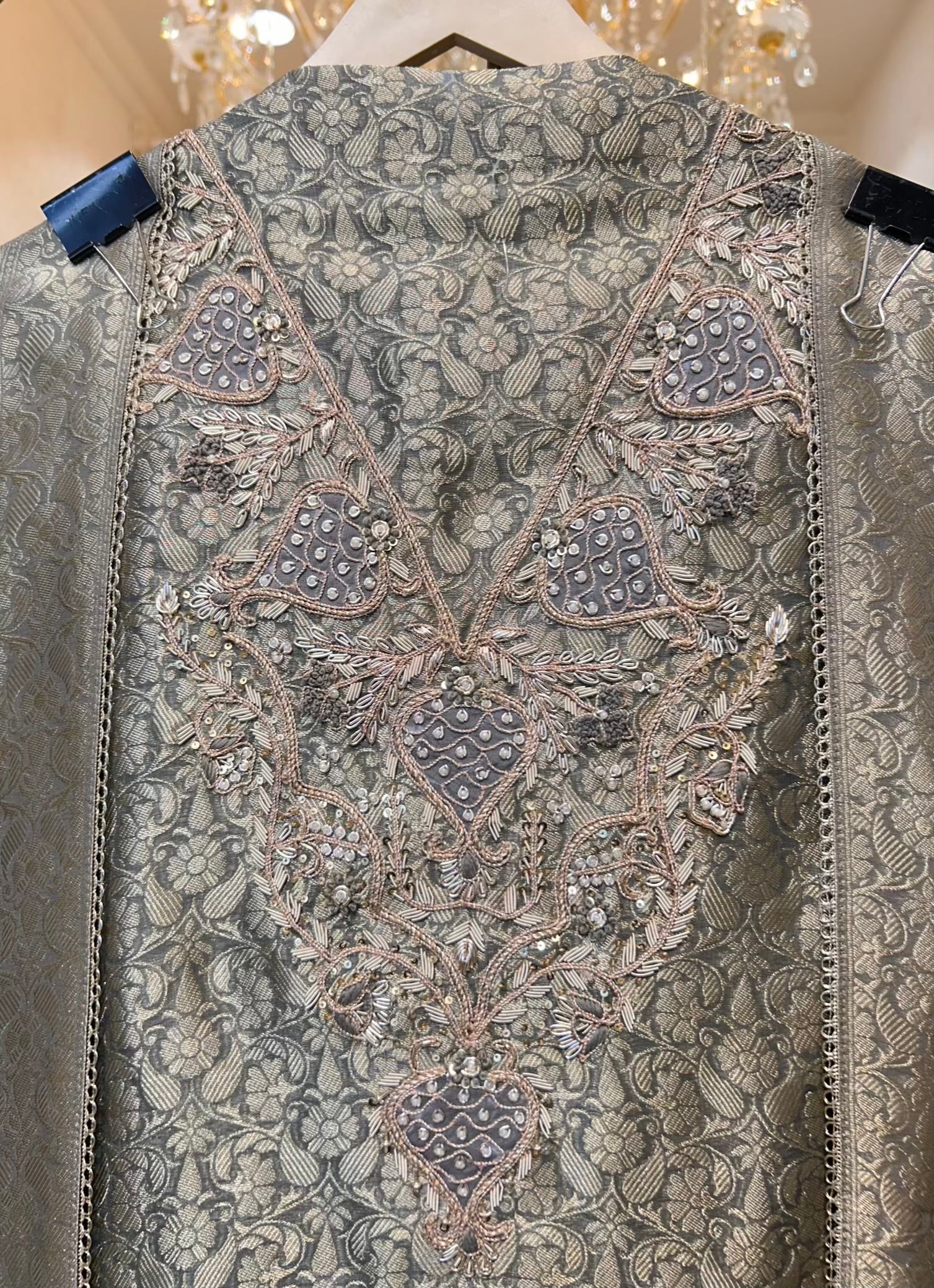 • Brocade Banarasi Suit (2.5 mtrs) – Woven with intricate texture and finished with elegant handwork at the neckline.