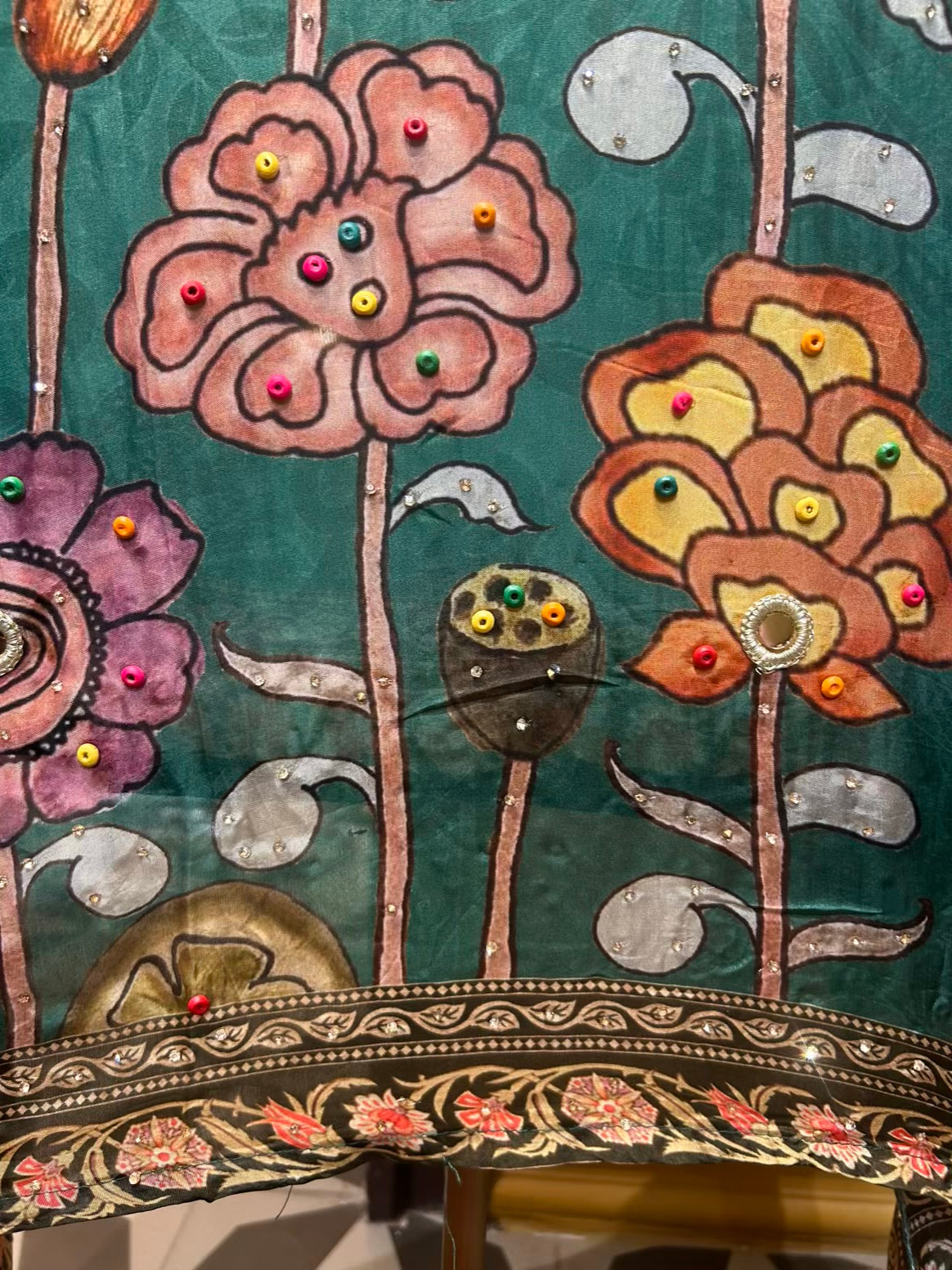 • Digital Printed Silk Organza Shirt (2.5 mtrs) – Accentuated with mirror and Dori embroidery along the neckline for a luminous finish.