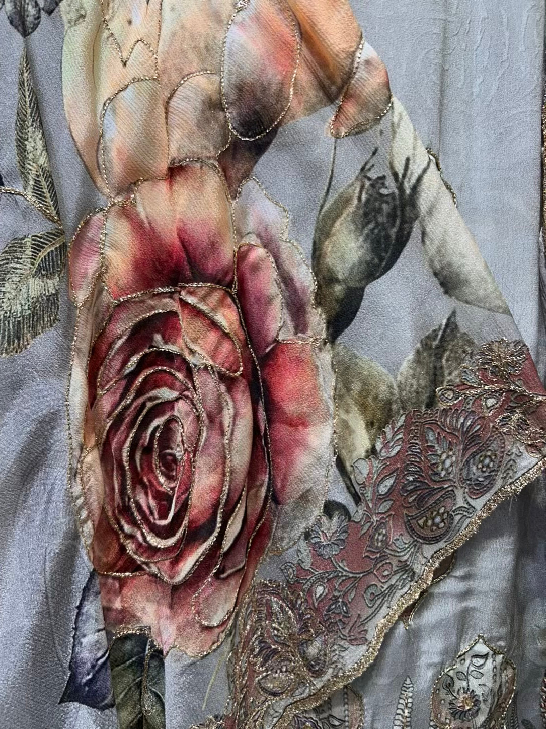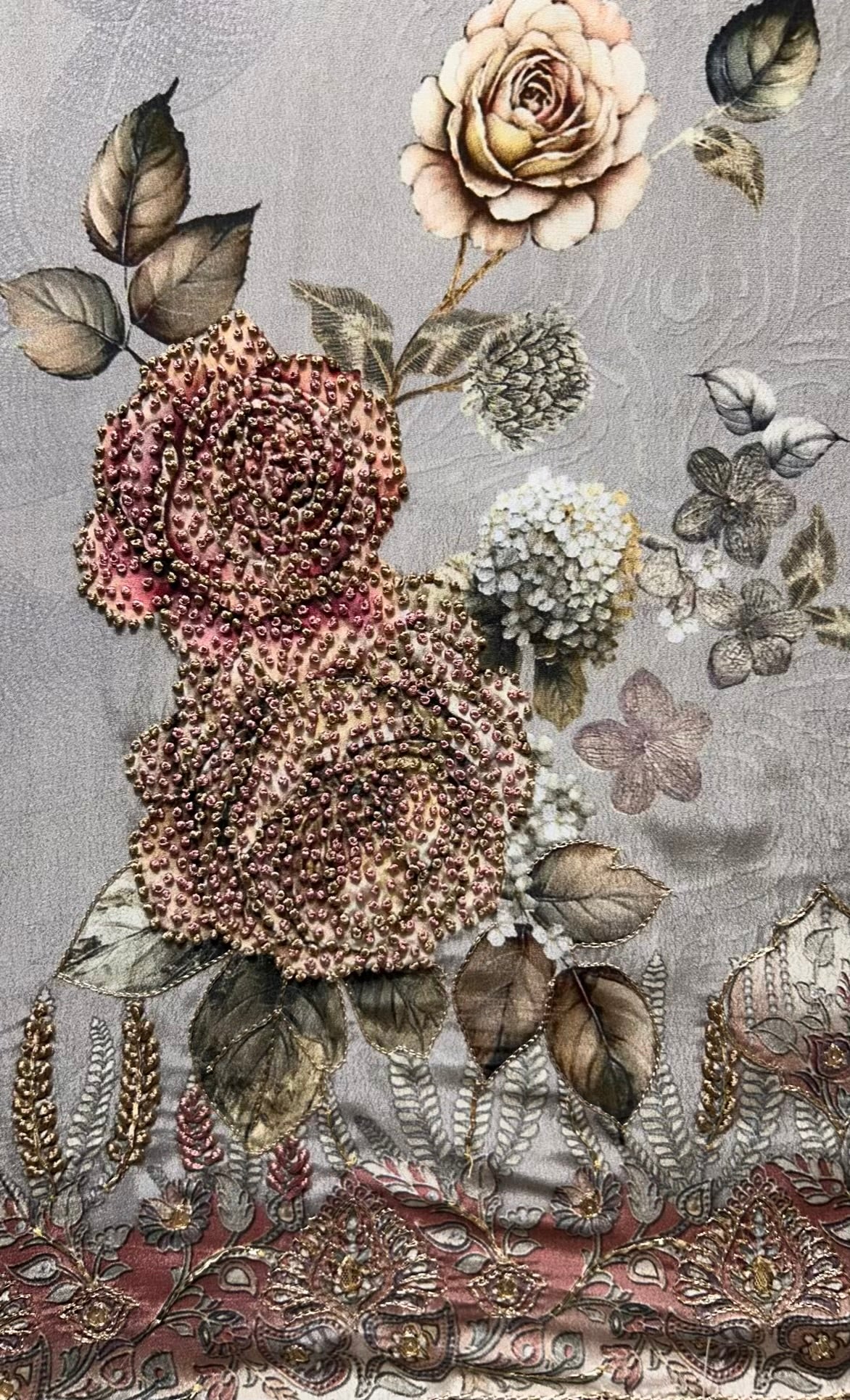 • Digital Printed Pure Crêpe Suit with Zari & Thread Work (2.5 mtrs) – Lightweight, elegant, and enriched with fine handcrafted detailing.