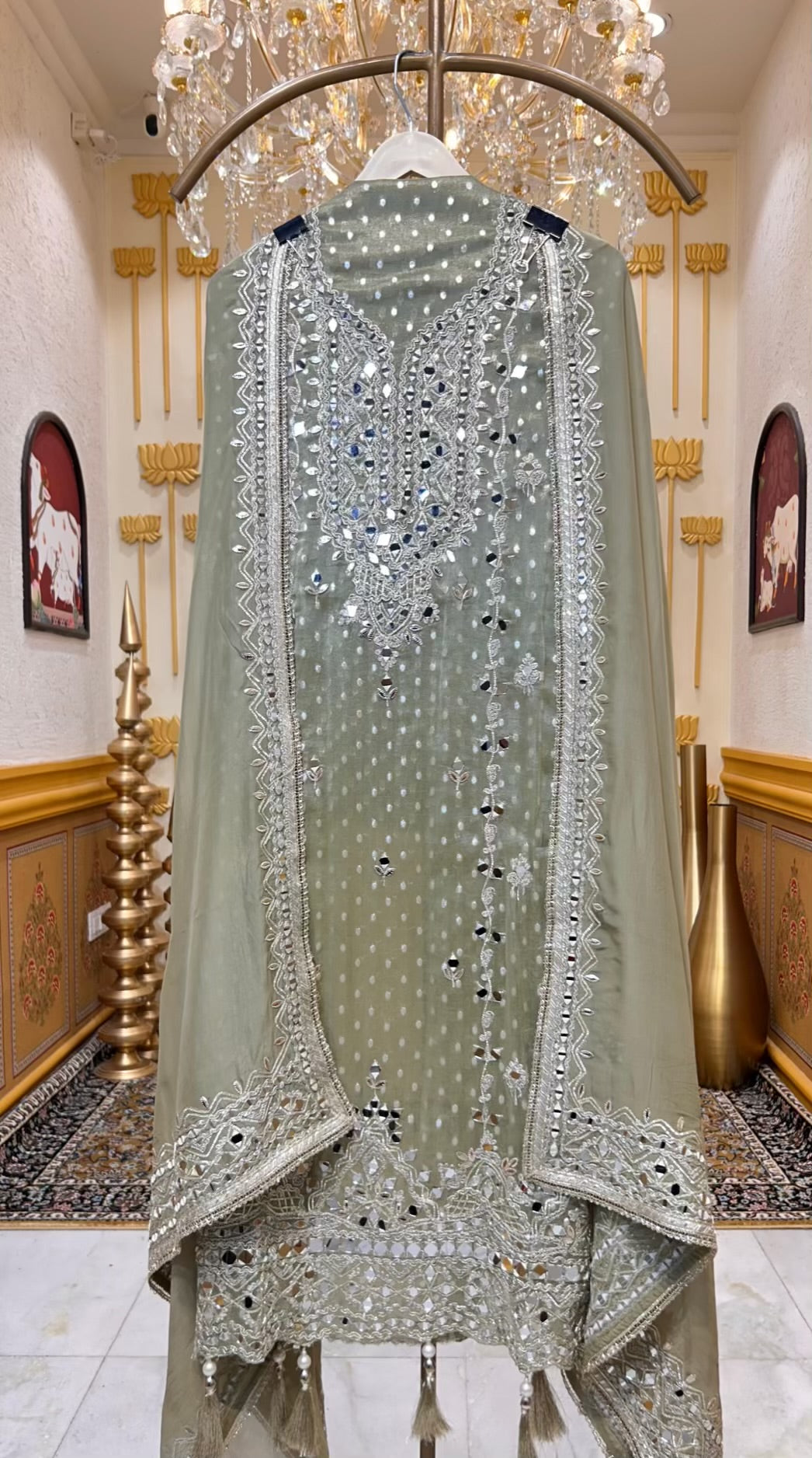 • Organza Dupatta (2.25 mtrs) – Finished with four-side mirror work borders for a cohesive, polished finish.