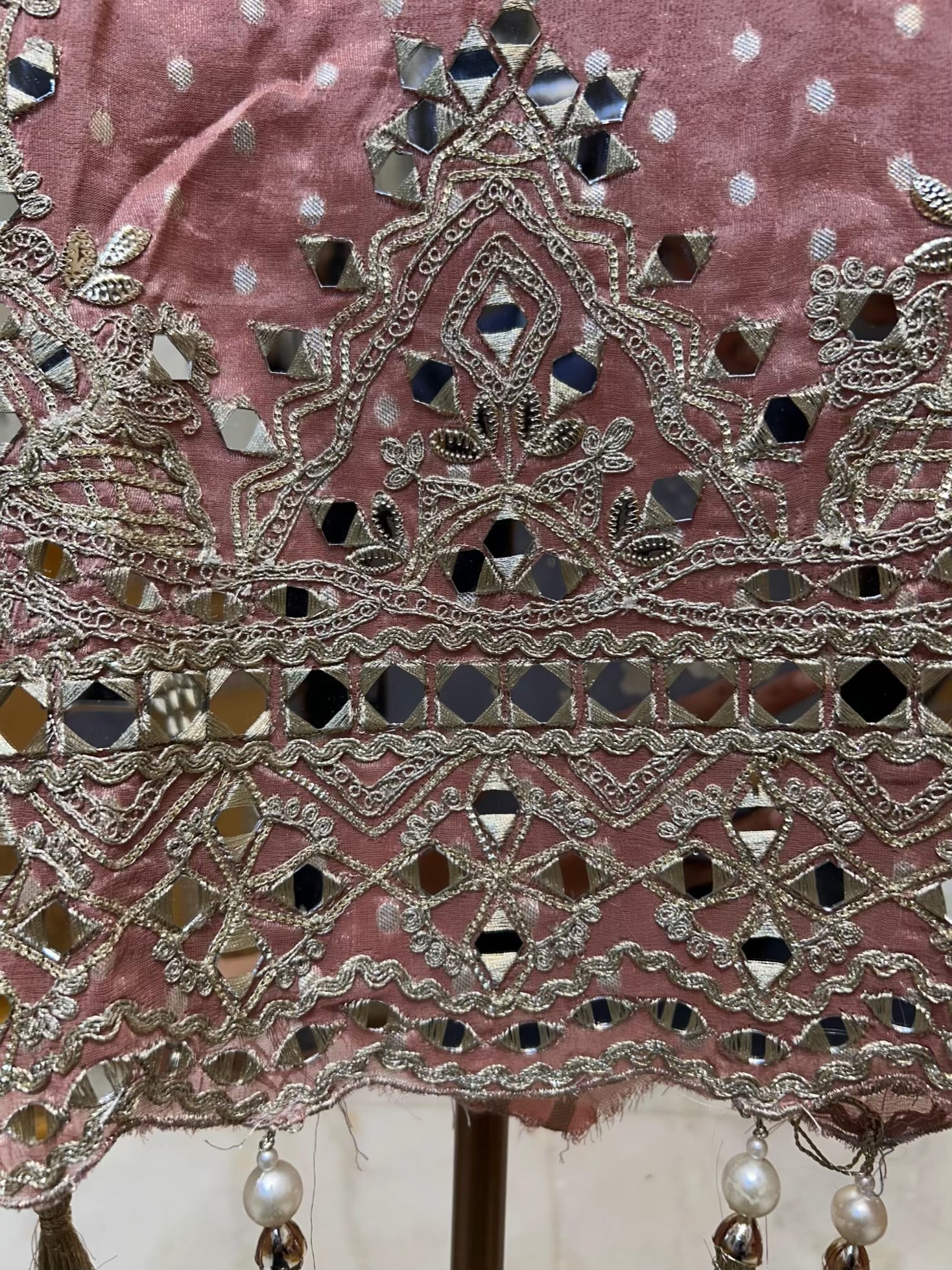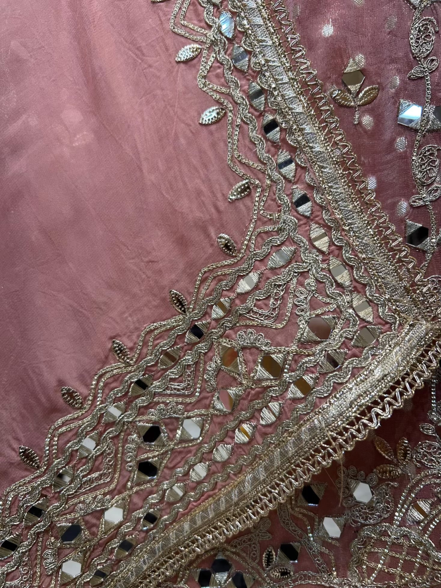 • Organza Dupatta (2.25 mtrs) – Finished with four-side mirror work borders for a cohesive, polished finish.