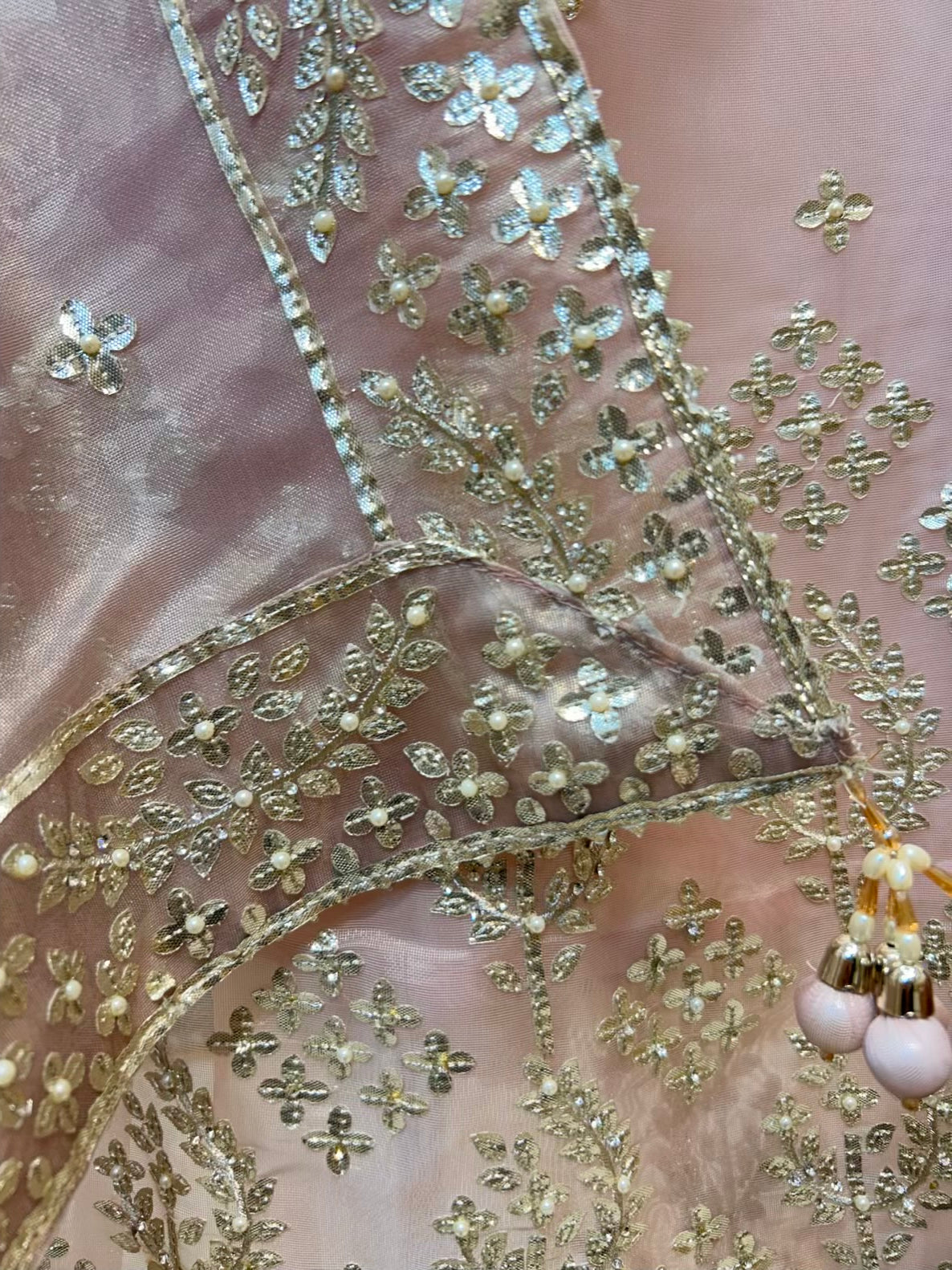 • Tissue Organza Dupatta (2.25 mtrs) – Finished with elegant four-side patchwork, adding depth and character to the drape.