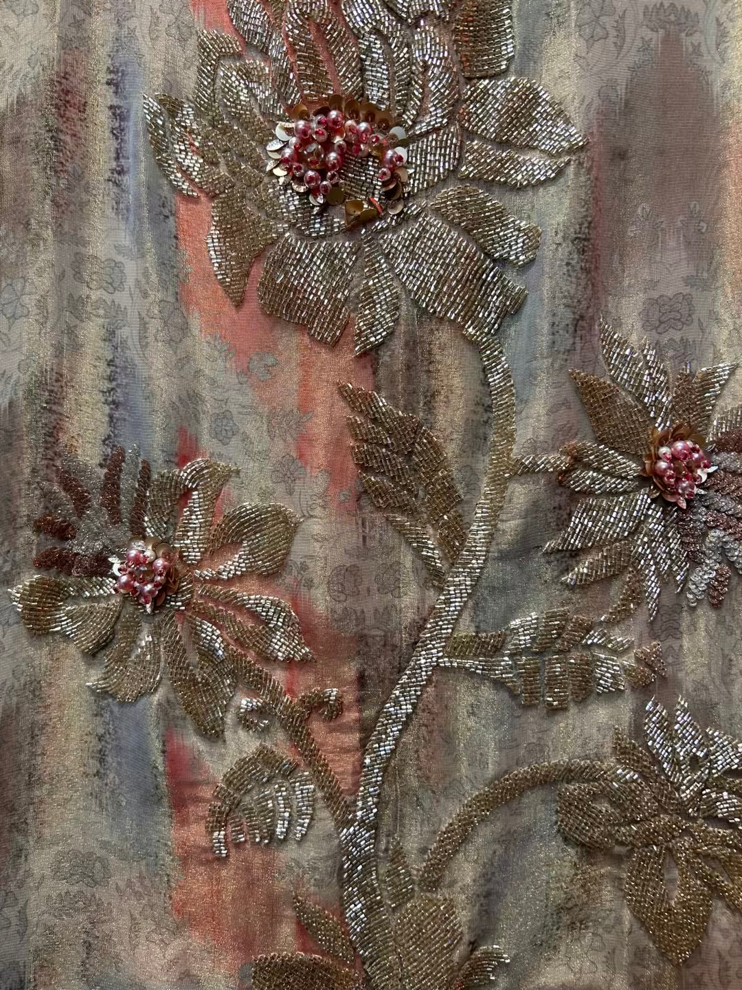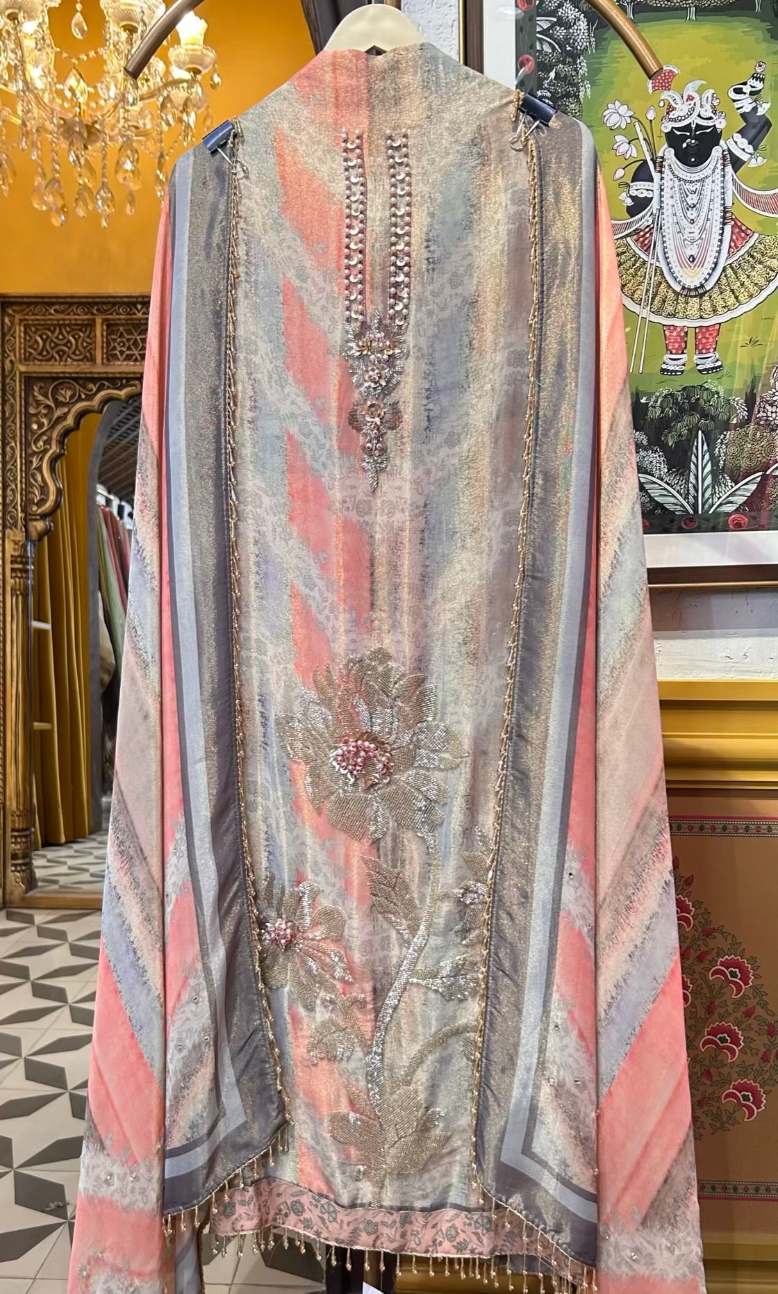 • Digital Printed Shimmer Organza Suit (2.5 mtrs) – Accented with fine handwork for a subtle festive sparkle.