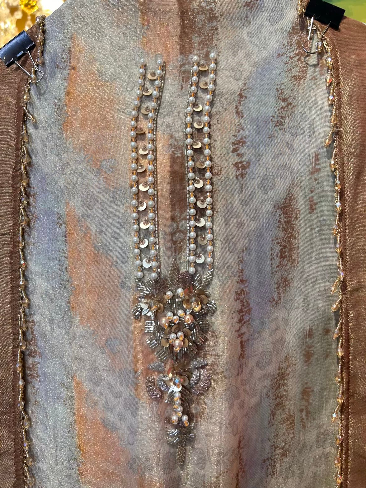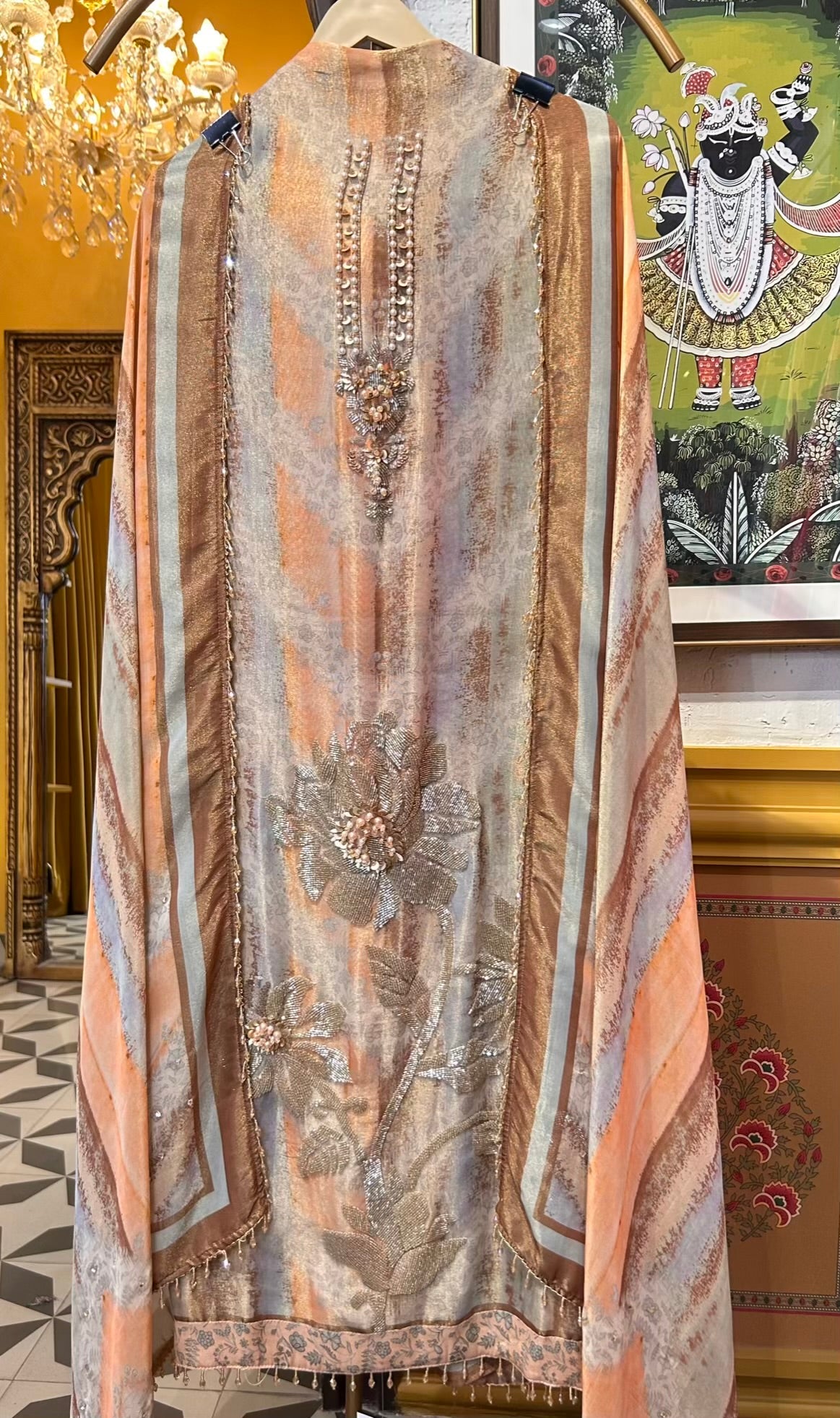 • Digital Printed Shimmer Organza Suit (2.5 mtrs) – Accented with fine handwork for a subtle festive sparkle.