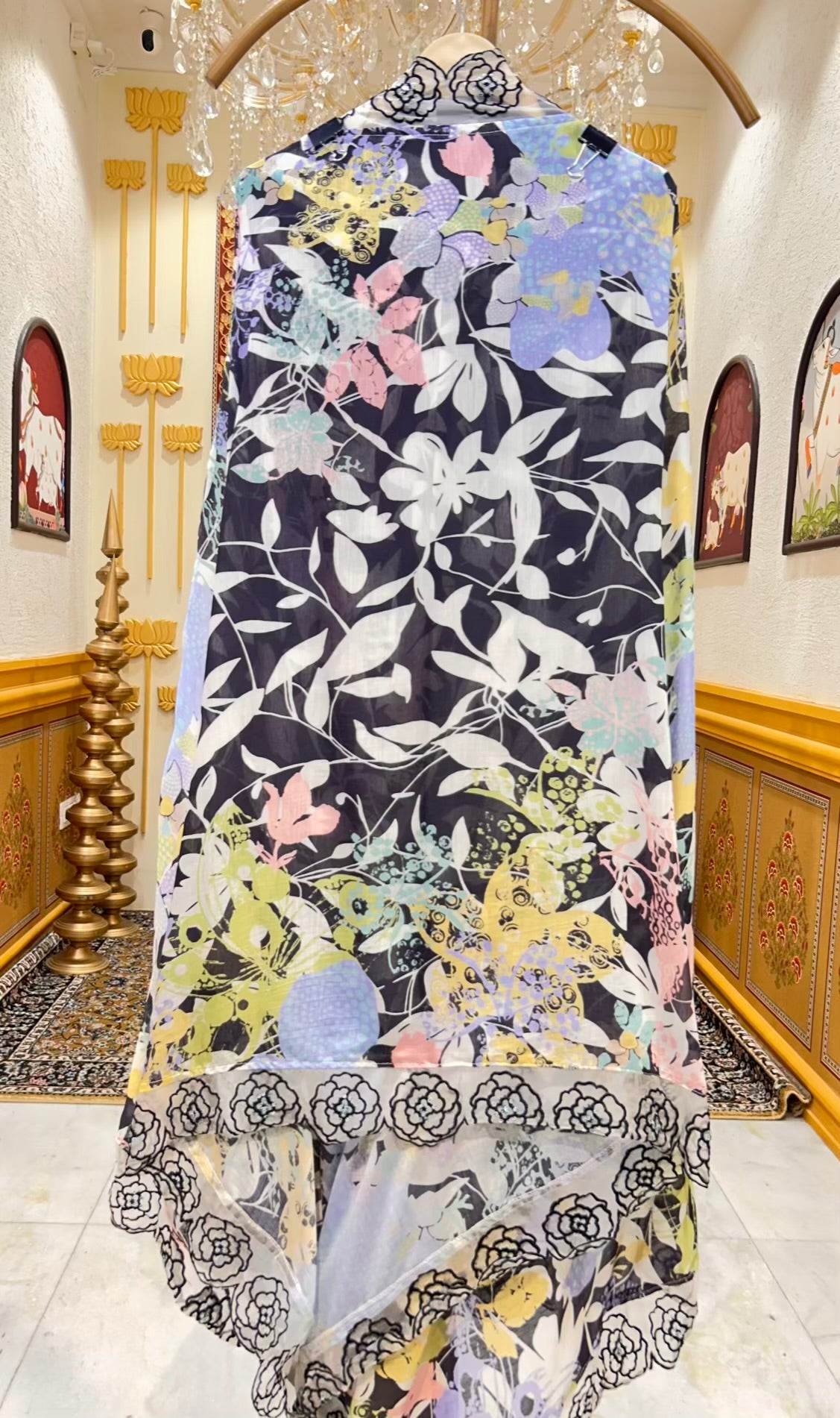 The ensemble is paired with a lightweight muslin dupatta, beautifully finished with a four-side lace border, lending graceful movement and refined structure to the look. A comfortable cotton bottom completes the set, ensuring effortless wear with a polished finish.