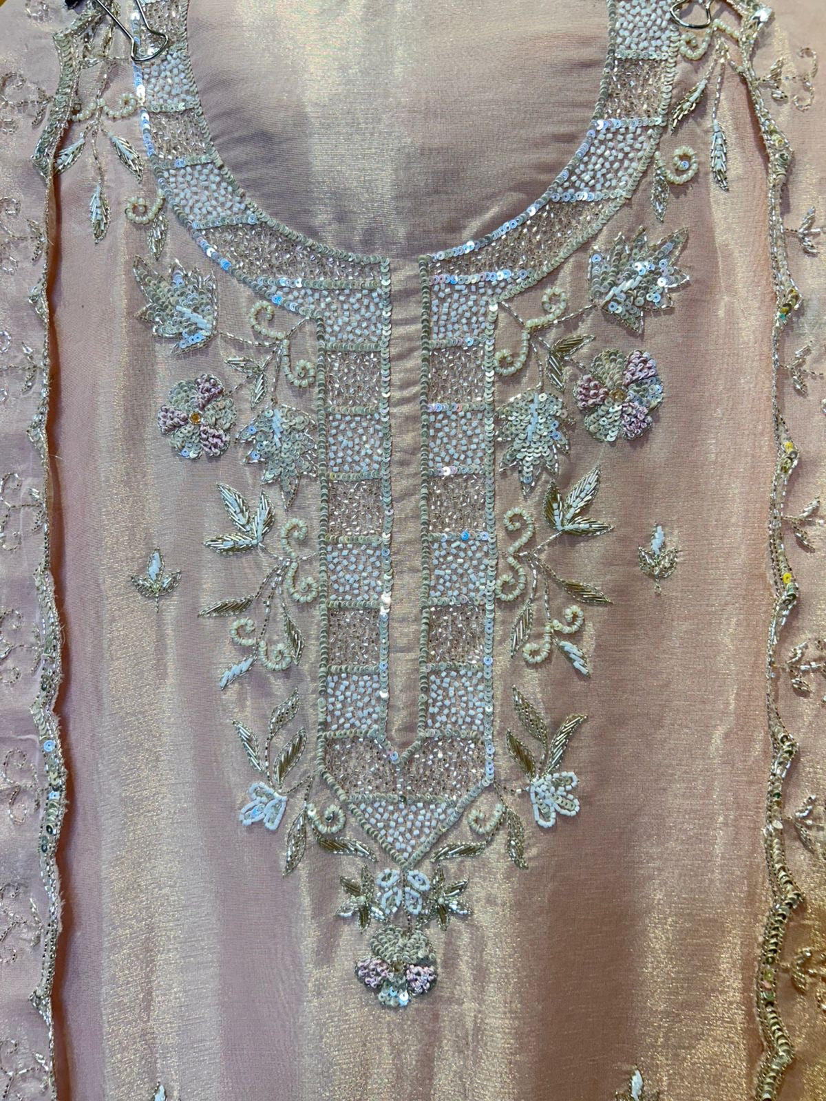 This elegant shimmer organza suit set is designed to radiate sophistication and grace. The shimmer organza shirt is beautifully highlighted with delicate handwork, adding a touch of artisanal charm to its luxurious texture. Paired with a rich silk bottom for comfort and refinement, the ensemble is completed with a matching shimmer organza dupatta that enhances its ethereal appeal. Perfect for festive gatherings, weddings, and special occasions, this outfit blends timeless elegance with modern charm.