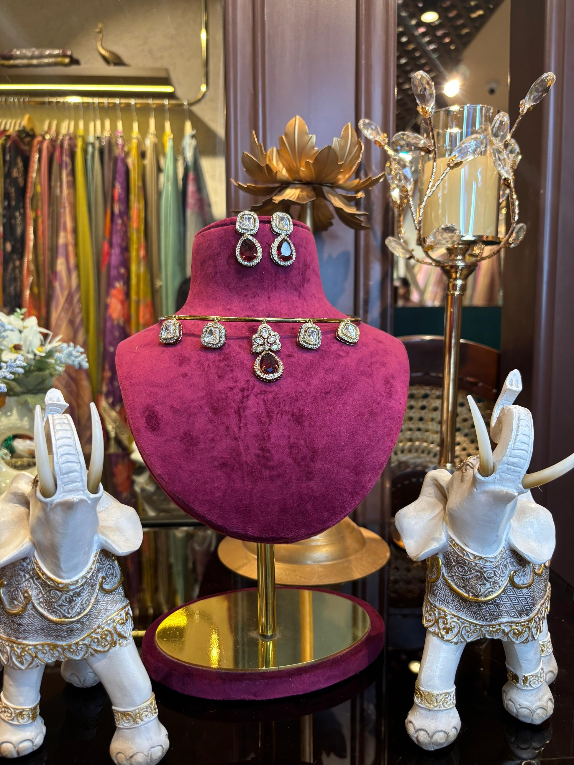 Where modern minimalism meets royal charm — the Elanora Choker Set exudes sophistication in its purest form. Designed with radiant stones framed in fine detailing, this sleek choker highlights elegance that speaks softly yet powerfully. Each colour variation — red, blue, and green — brings its own aura of regality, making it a timeless addition to any festive or formal ensemble.