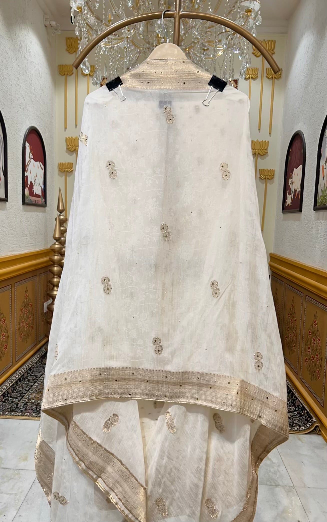 Paired with a matching silk organza Banarasi dupatta finished with a classic four-side border, and a smooth silk bottom for structure and comfort, this ensemble strikes the perfect balance between tradition and modern elegance.