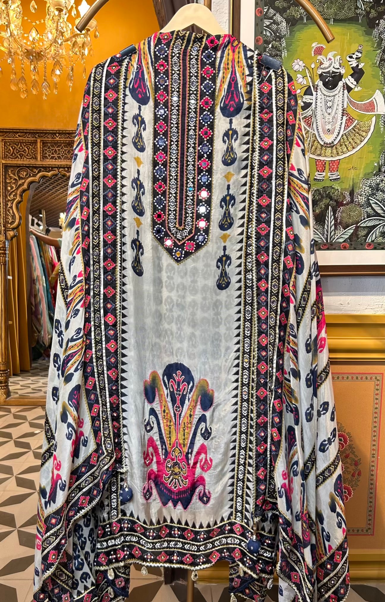 • Silk Organza Shirt (2.5 mtrs) – Digitally printed and detailed with mirror handwork for a luminous appeal.