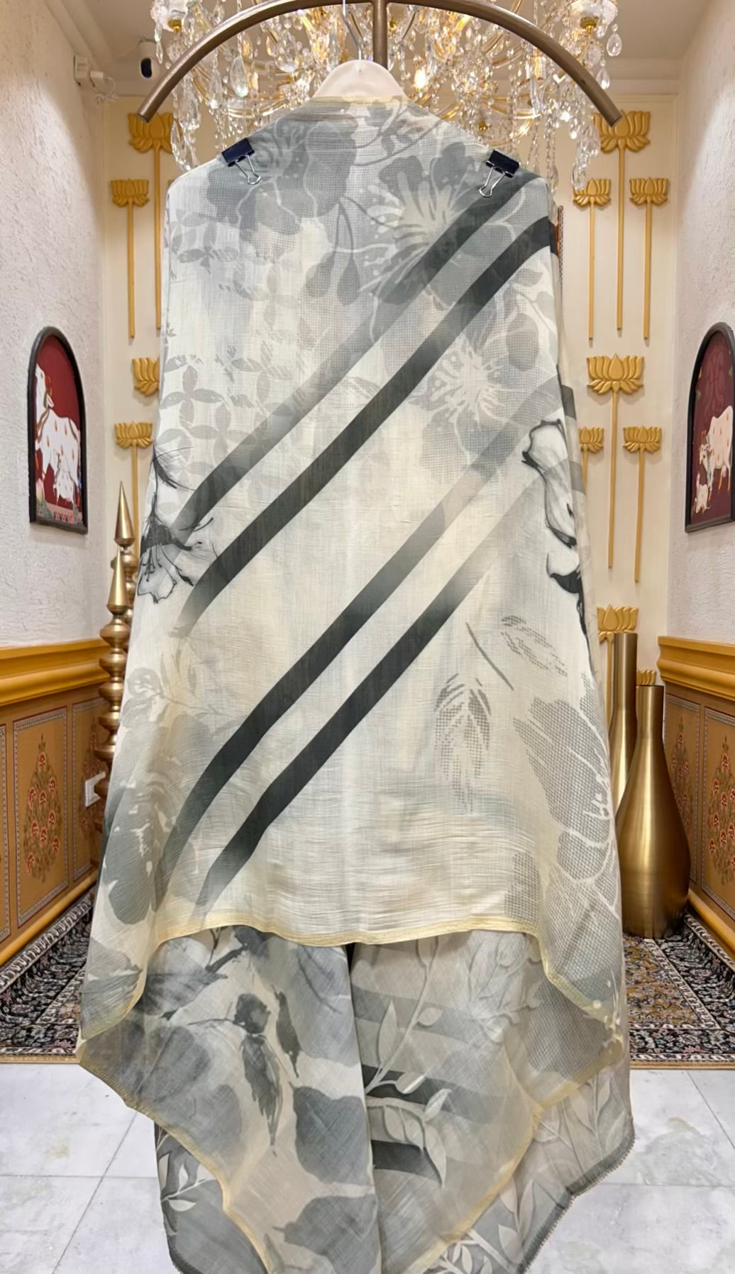 Paired with a fluid digitally printed muslin dupatta that complements the ensemble beautifully, and a comfortable cotton shantoon bottom for ease of wear, this set brings together artistry, comfort, and timeless charm — perfect for understated festive dressing.