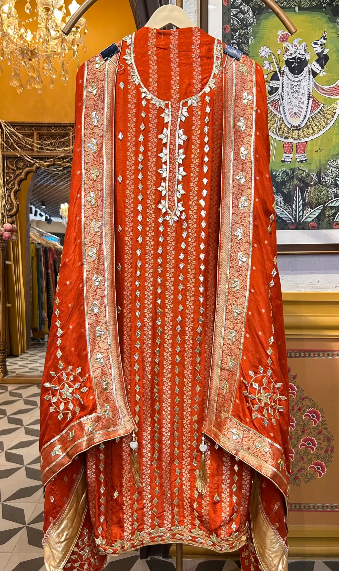 • Banarasi Silk Suit (2.5 mtrs) – Embellished with all-over gota work for a radiant, festive finish.
