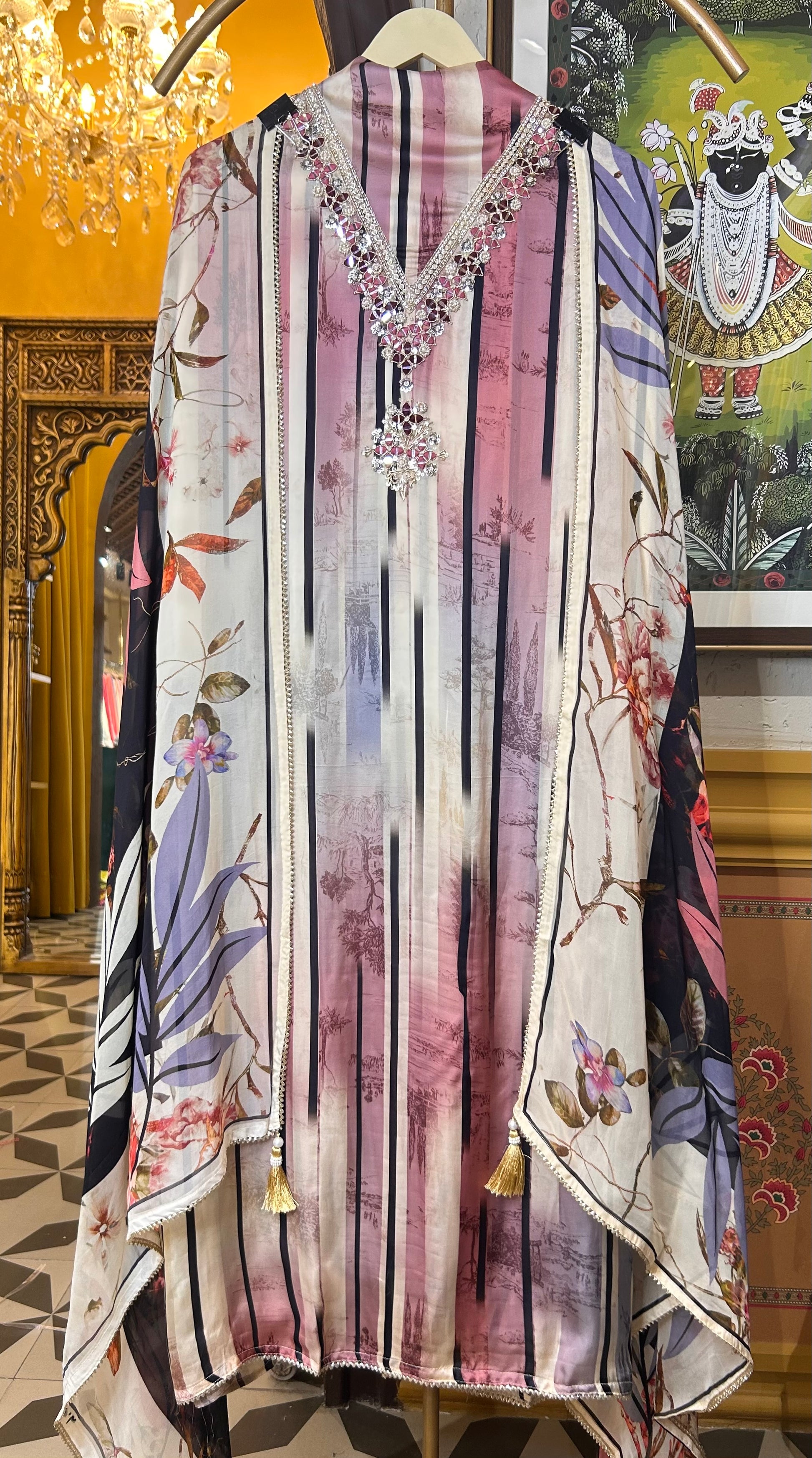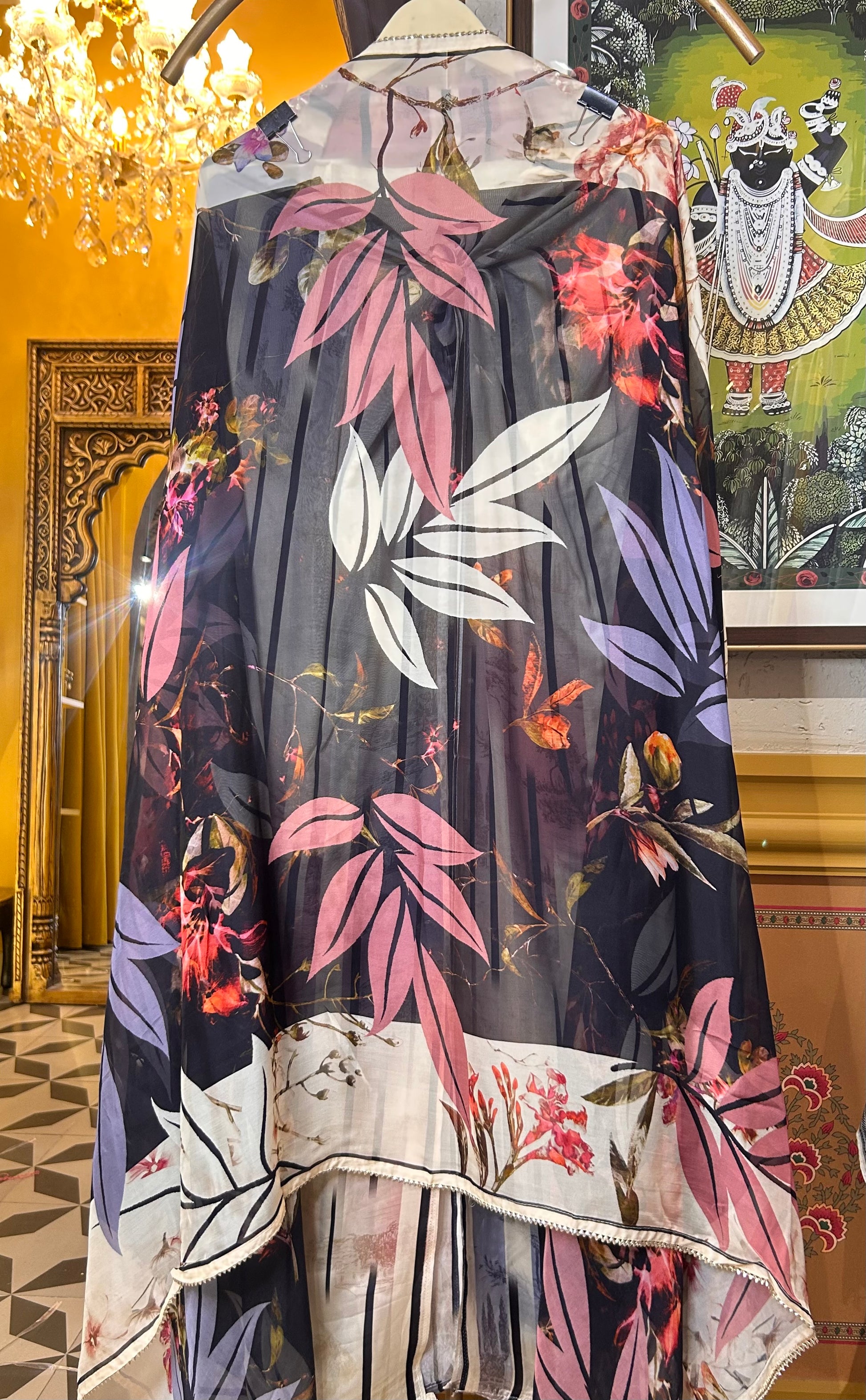 A breezy drape adorned with artistic digital prints on silk organza, balancing tradition with modern flair.