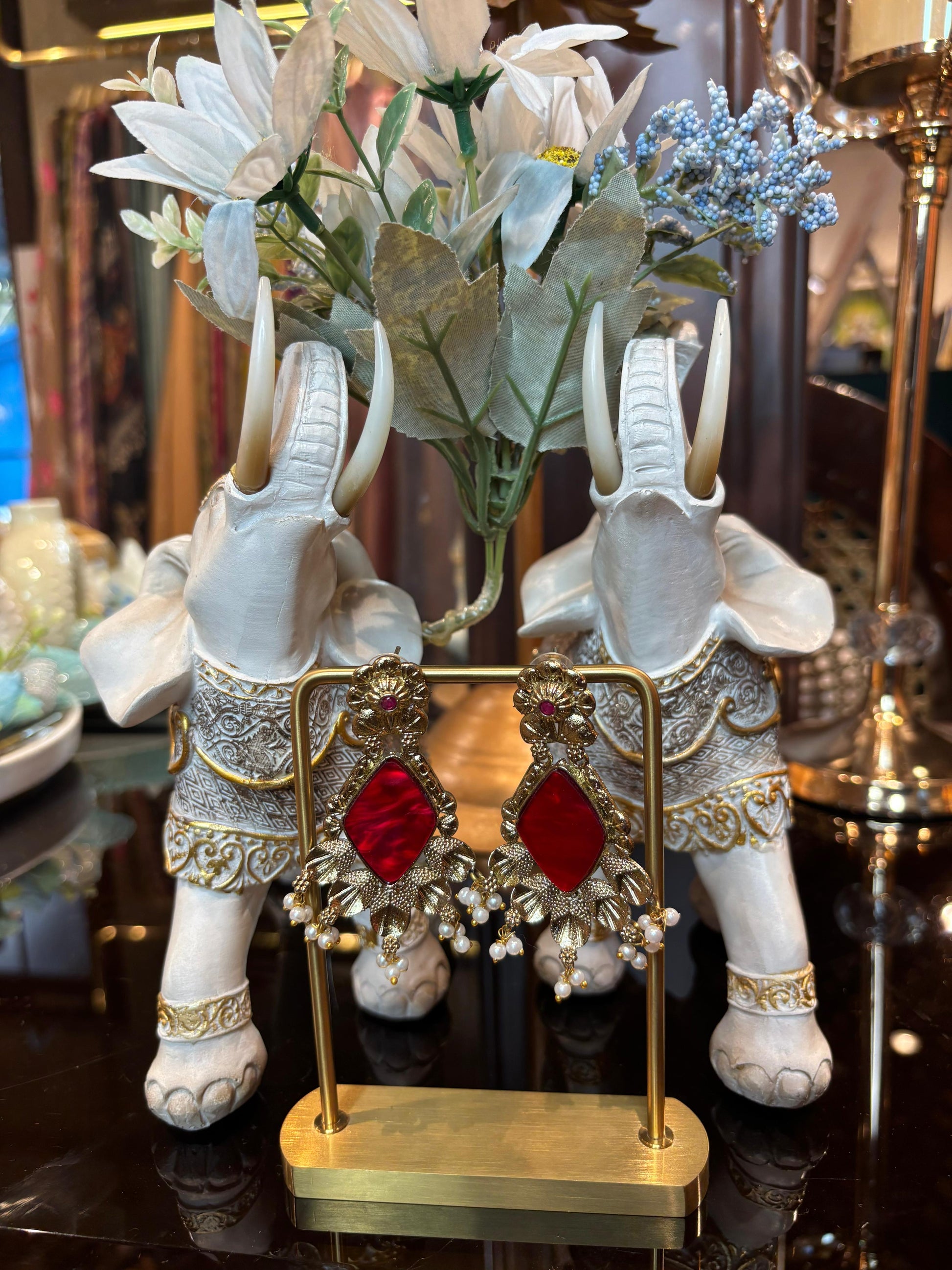 Inspired by regal charm and vintage opulence, the Gulbahar Drop Earrings are a statement in elegance. Crafted with intricate floral motifs, pearl danglings, and a lustrous stone centrepiece, these earrings exude timeless sophistication. Whether styled with ethnic ensembles or fusion wear, they lend a touch of royal grandeur to every look.