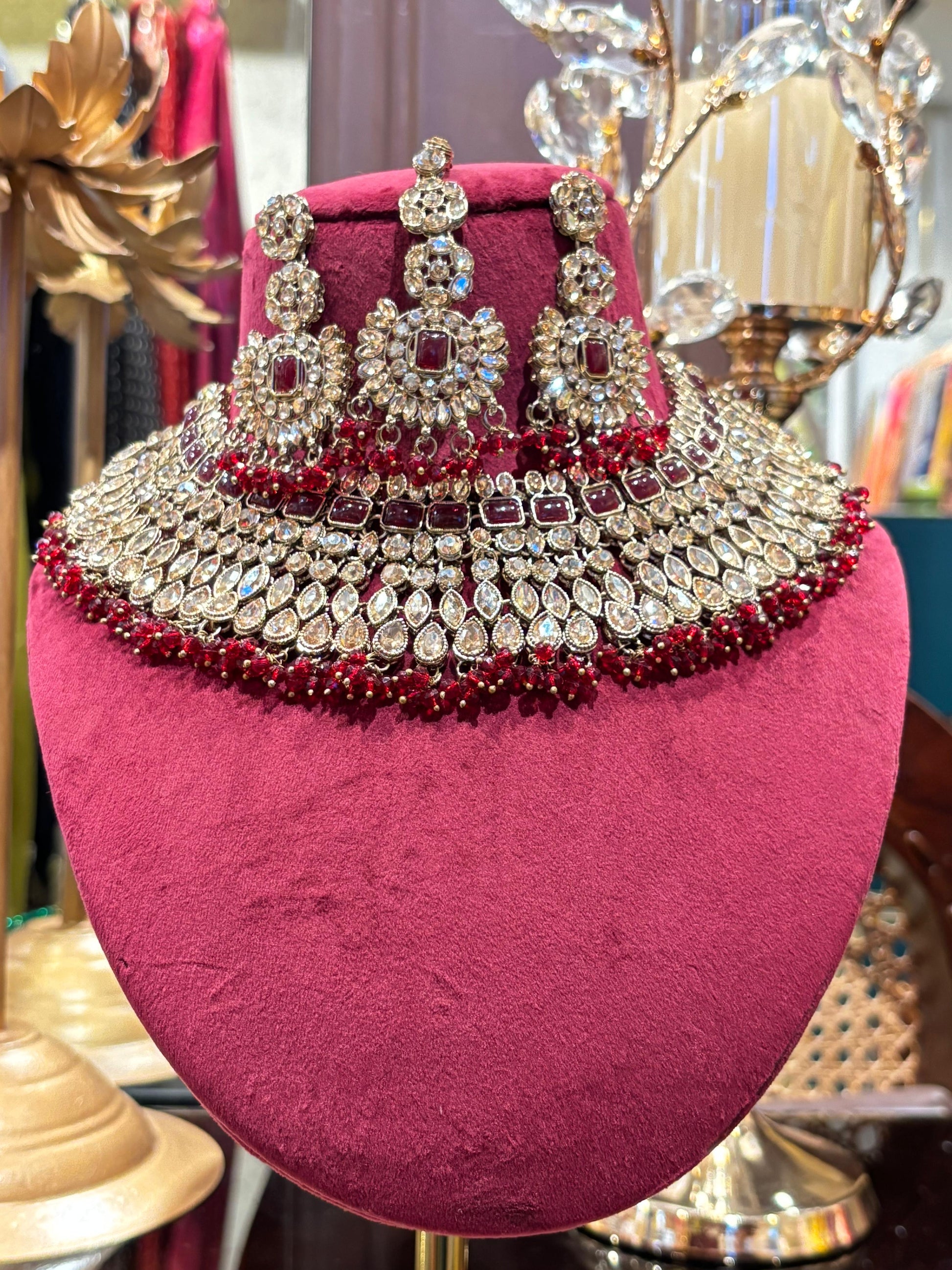 • Choker Necklace – Embellished with uncut Kundan stones, ruby-hued detailing, and fine red beading.
