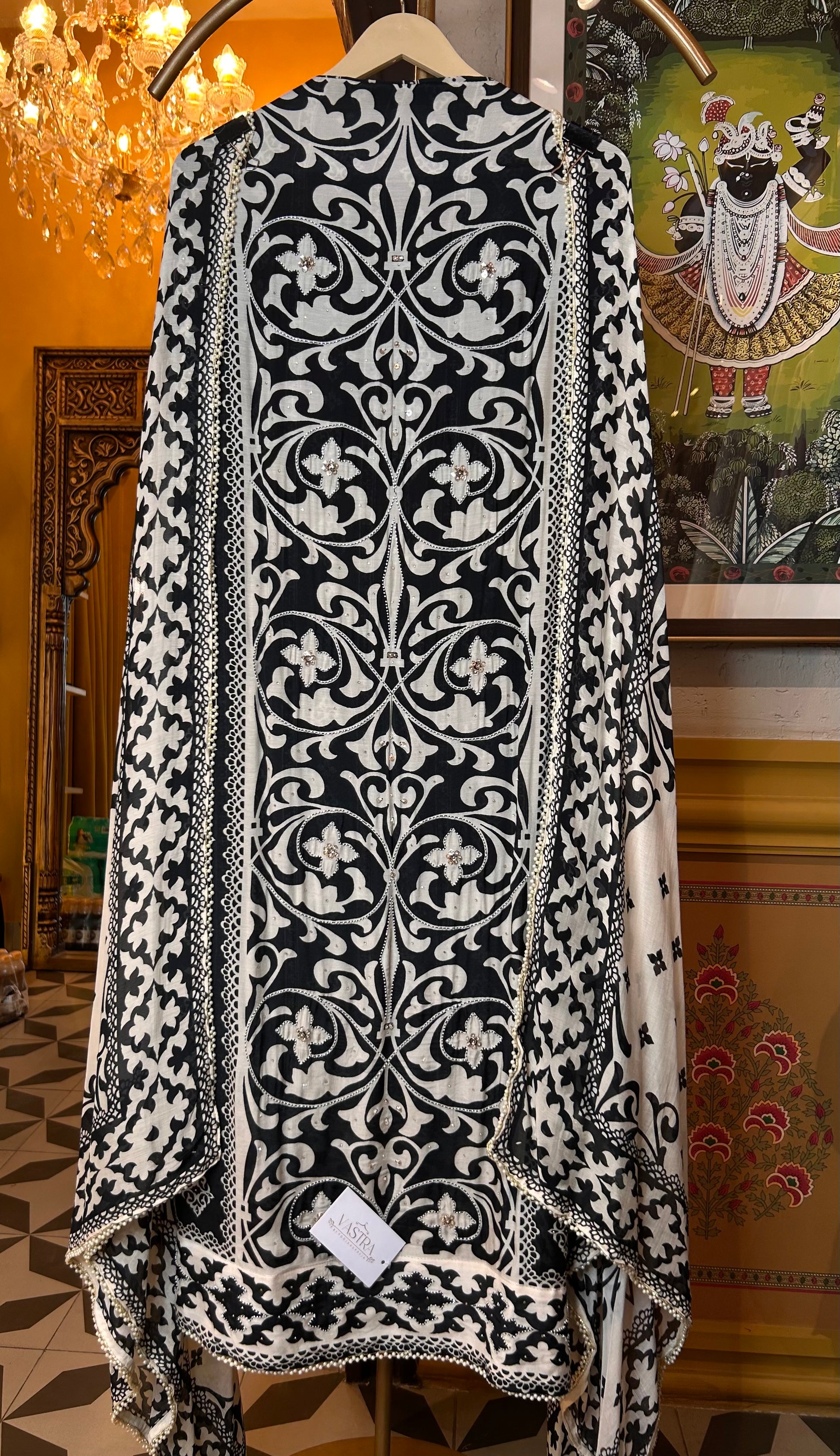 Feather-light and fluid, the digitally printed dupatta adds a splash of elegance with soft, flowing motifs that complement the shirt’s handwork beautifully.