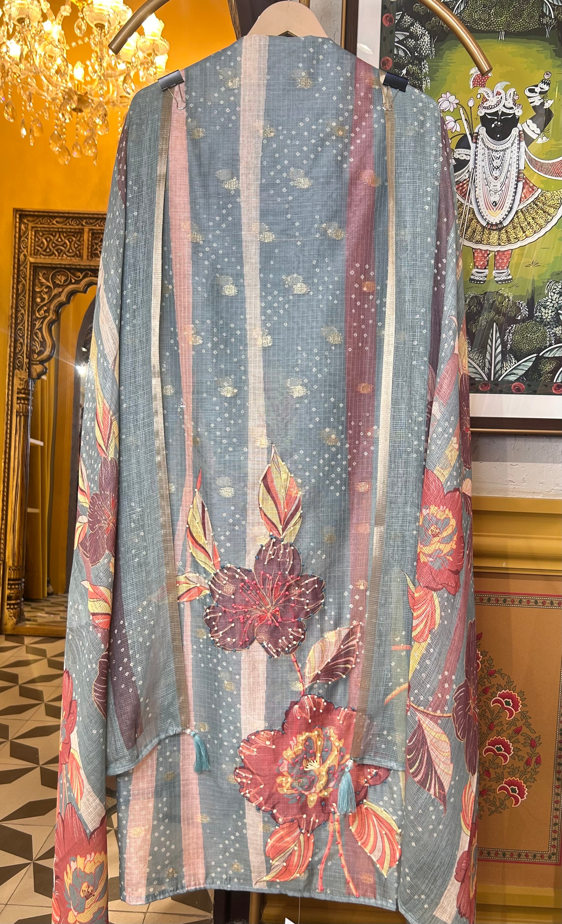 Airy and graceful, the dupatta mirrors the shirt’s charm with matching digital prints that add continuity and flow.