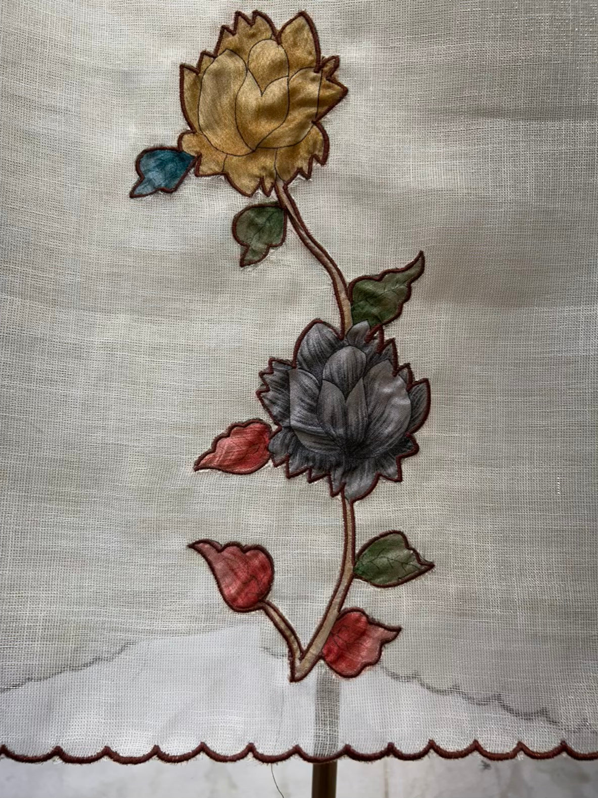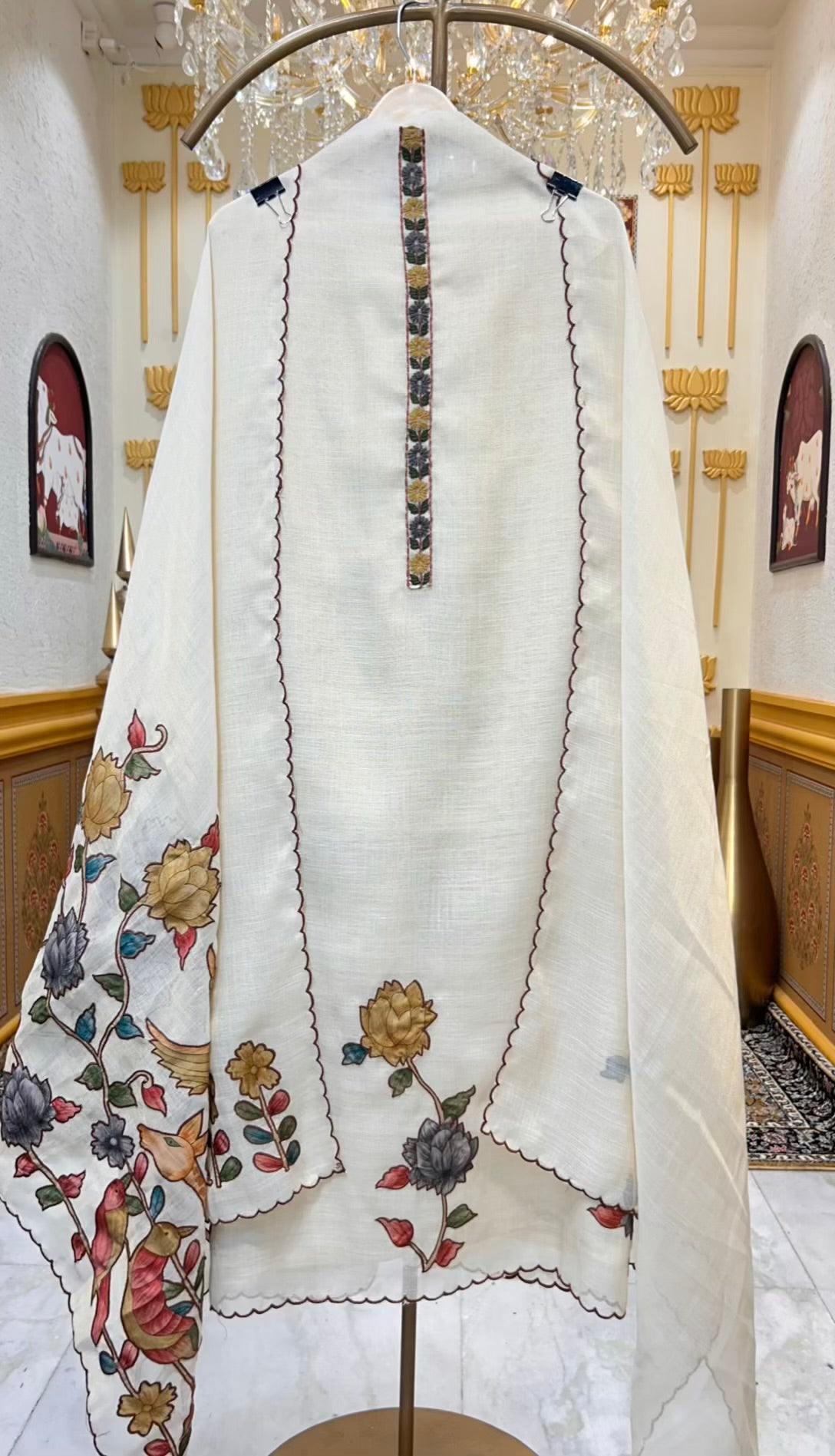 Effortlessly graceful and understated — this Inara Linen Suit is designed for those who appreciate quiet elegance with everyday sophistication. Crafted in breathable shimmer linen, the suit offers a soft sheen and fluid fall, making it ideal for both day and evening wear. Paired with a coordinated shimmer linen dupatta and a comfortable cotton shantoon bottom, the ensemble balances ease, texture, and timeless charm.