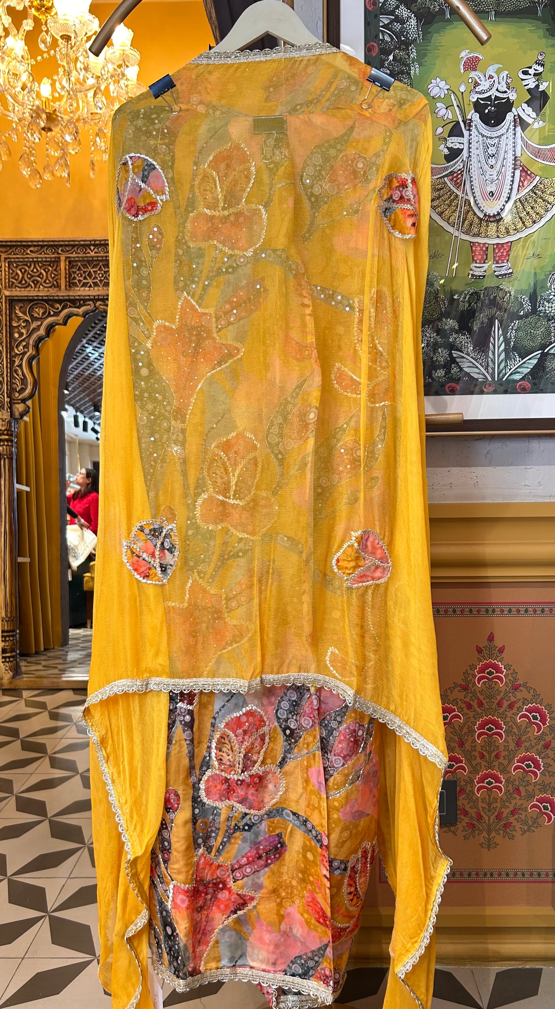 The Iraah Suit combines the delicate texture of digital printed organza with gota patti accents for a refined yet festive look. Finished with a soft chiffon dupatta and breathable cotton bottom, this set brings you effortless elegance.