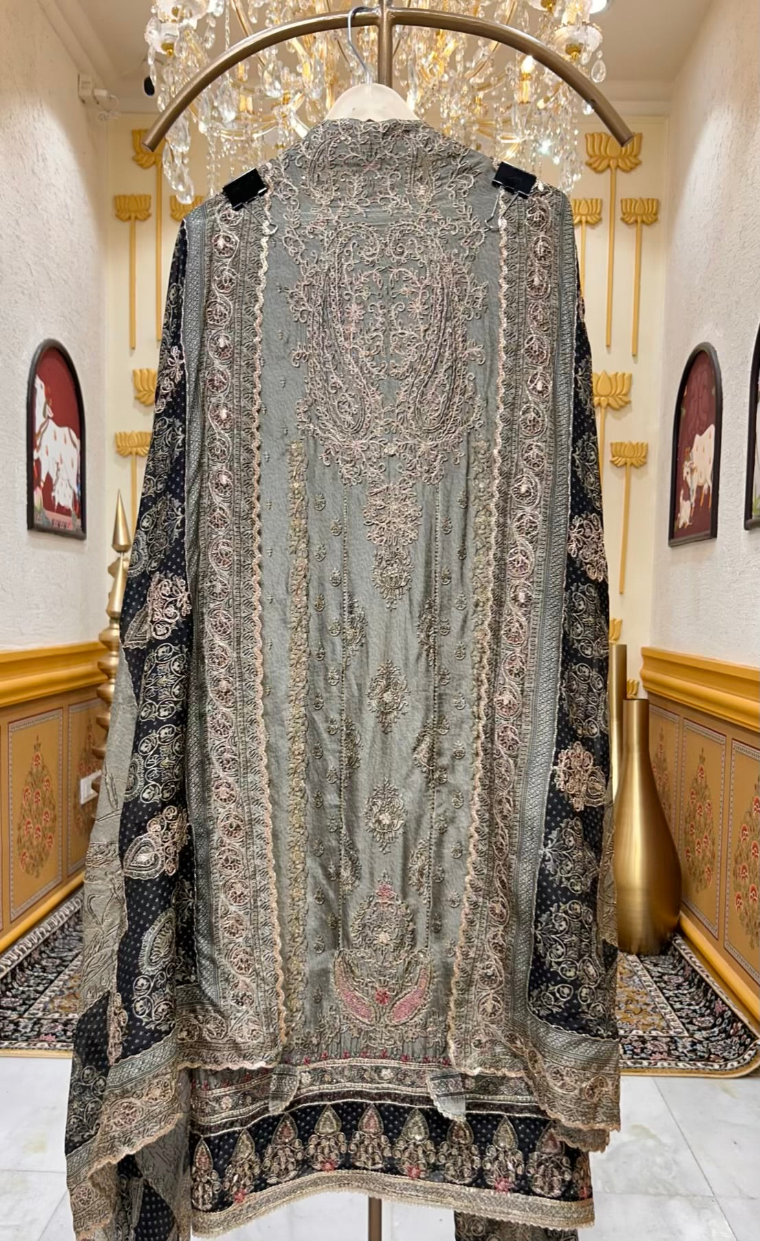 Paired with a coordinated digitally printed pure crêpe dupatta highlighted with zari accents, and a matching crêpe bottom finished with a zari border, this ensemble flows seamlessly from day to evening wear — graceful, versatile, and timeless.
