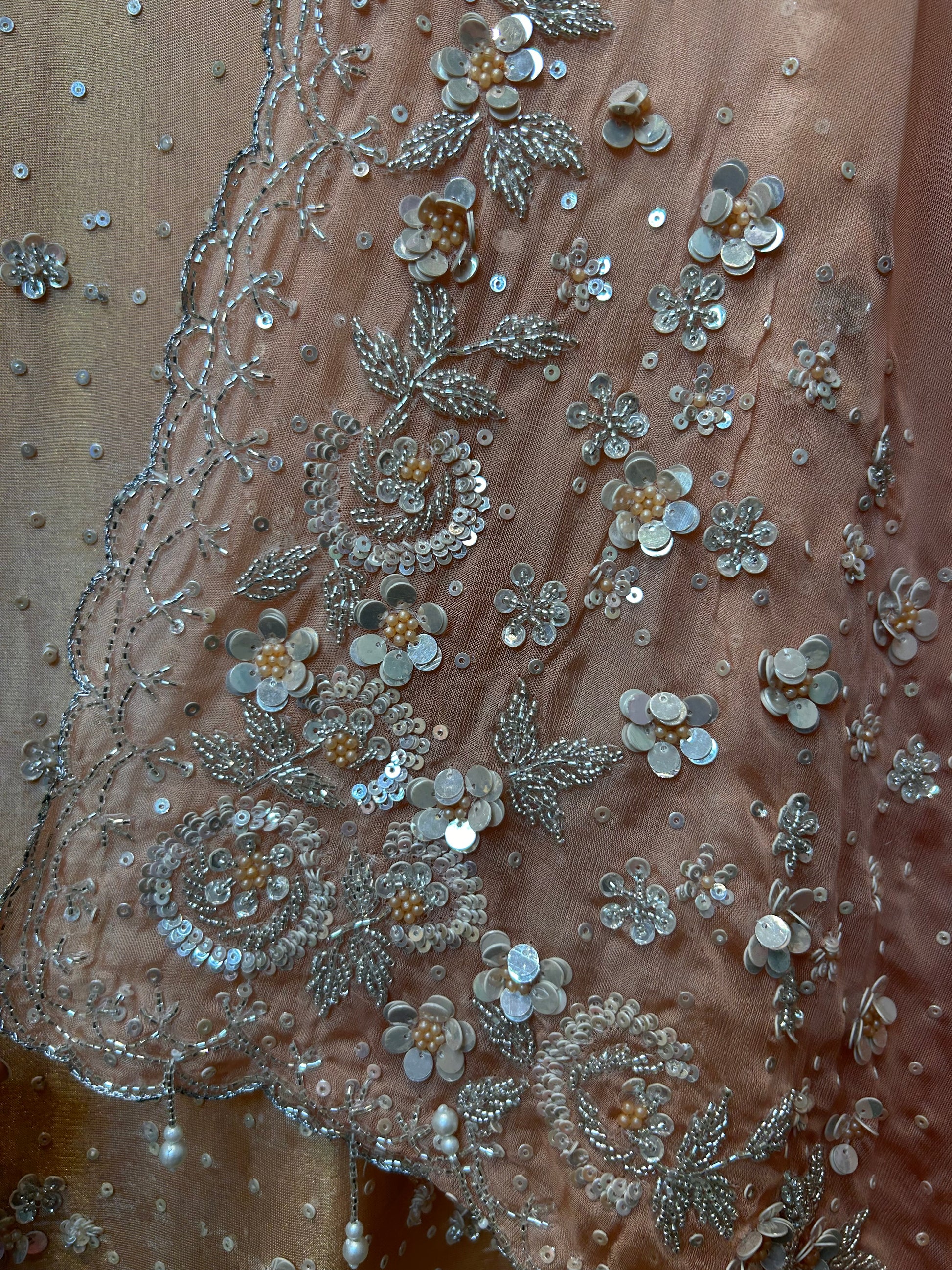 A fluid shimmer base adorned with intricate handwork and gleaming sequin detailing — perfect for graceful silhouettes that captivate.