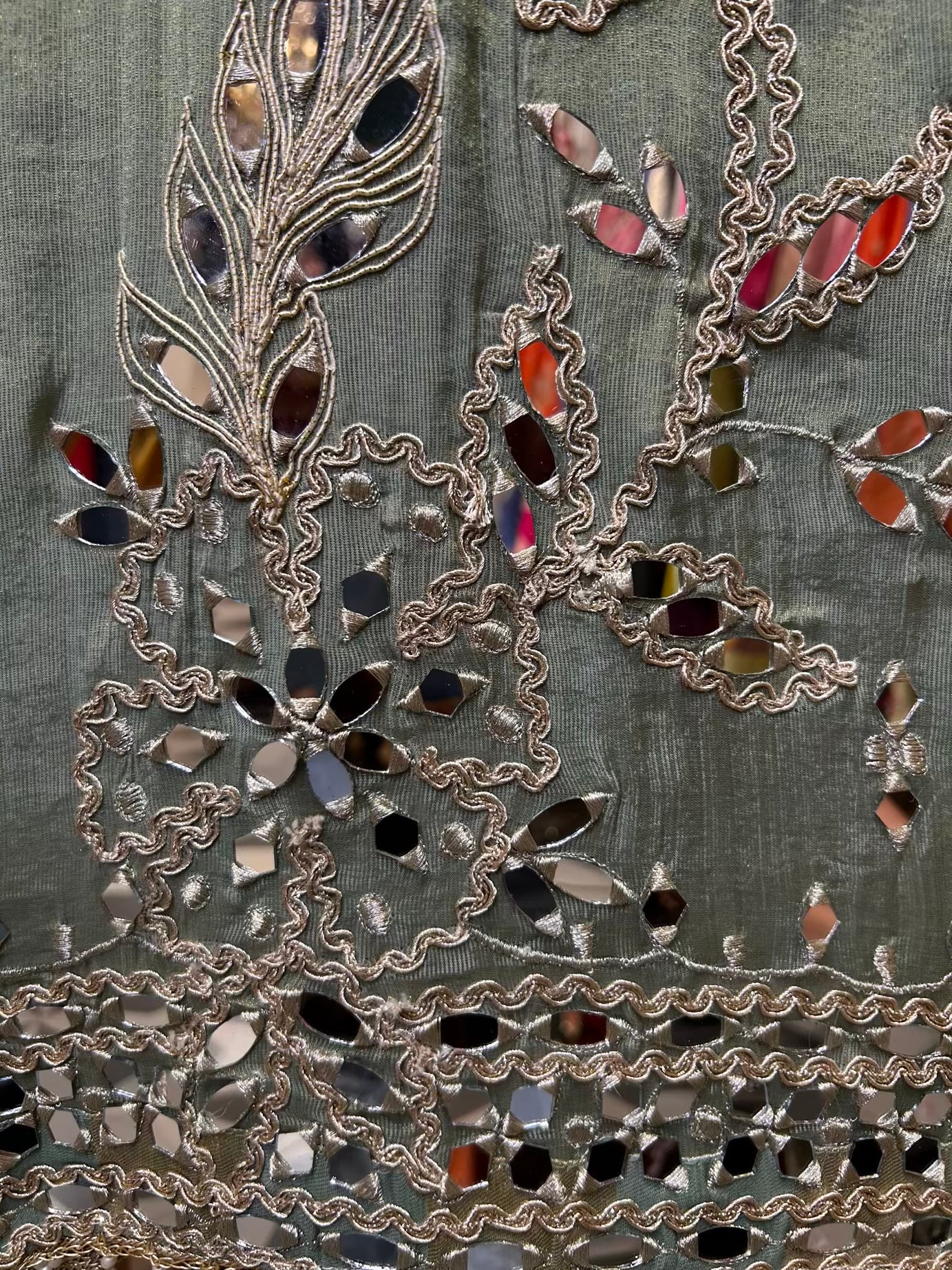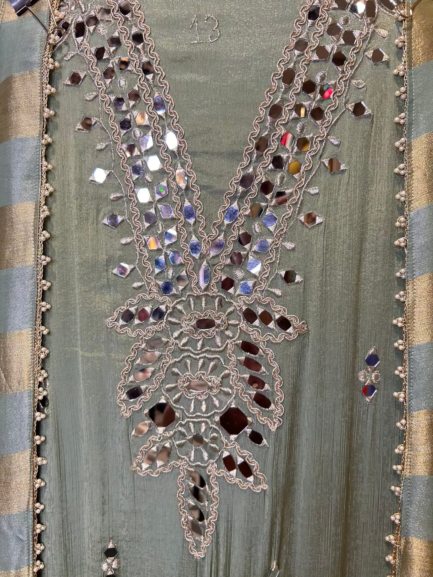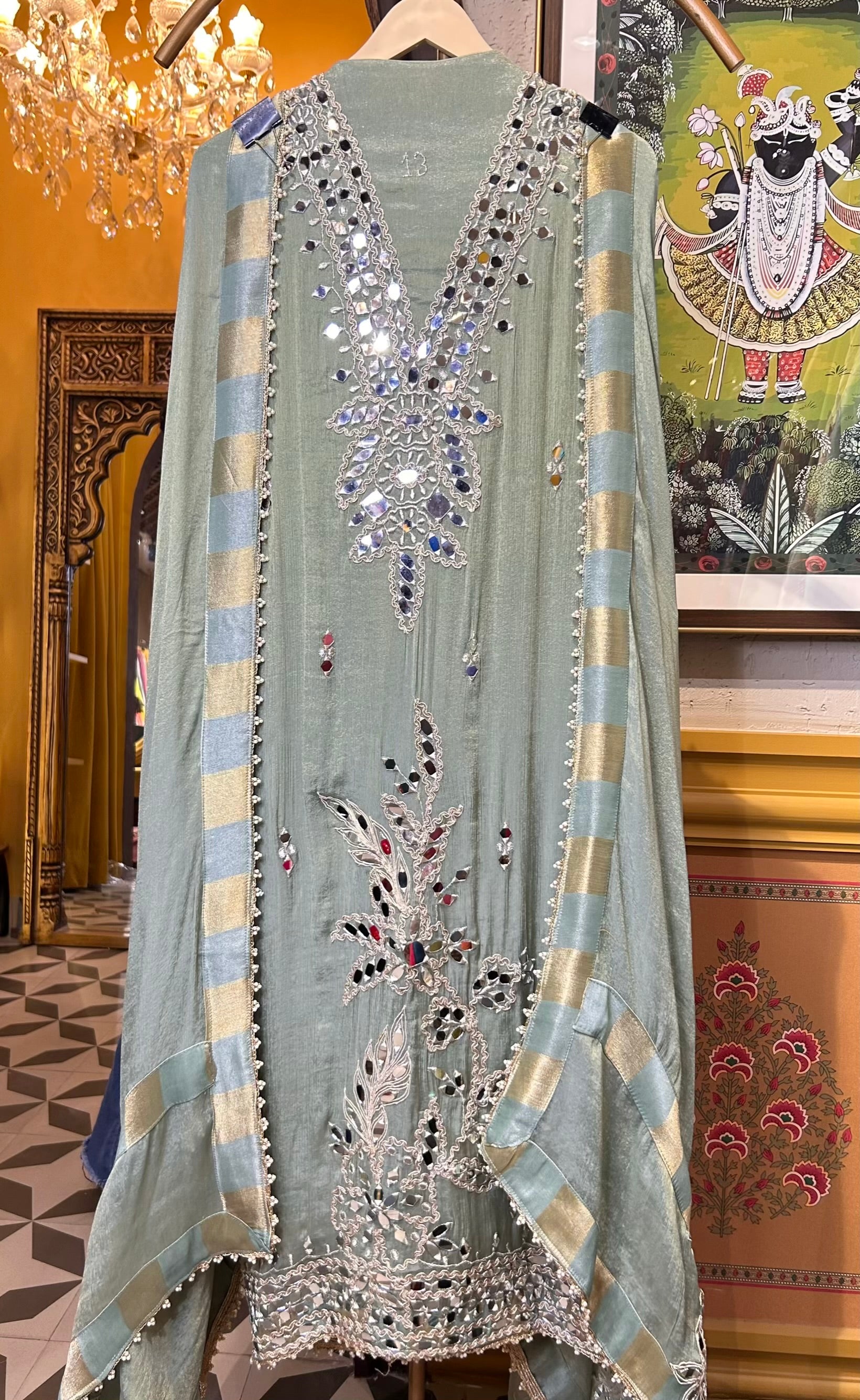 - Shimmer Organza Suit (2.5 mtrs) – Handcrafted with real mirror and fine Dori work for timeless appeal.