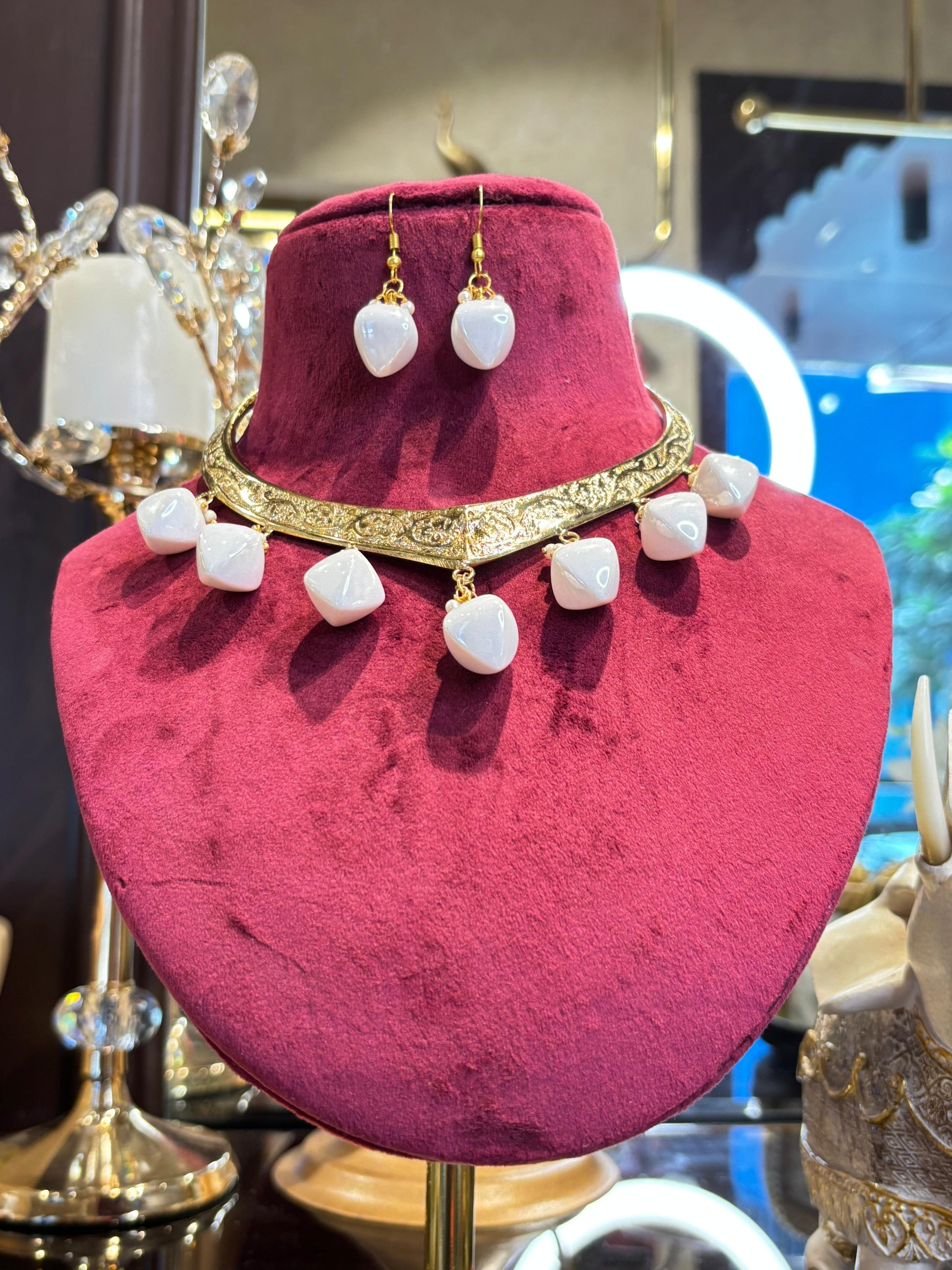 Crafted with an intricately carved gold-toned band, the hasli is adorned with lustrous coloured stones that exude quiet luxury. Perfect for festive gatherings, wedding soirées, or intimate celebrations, this set brings regal poise to every look.