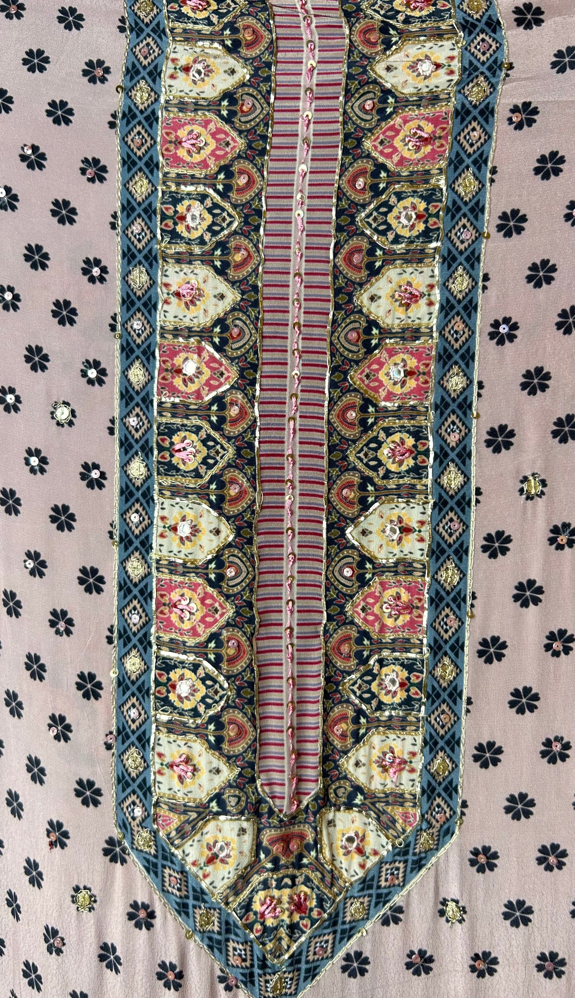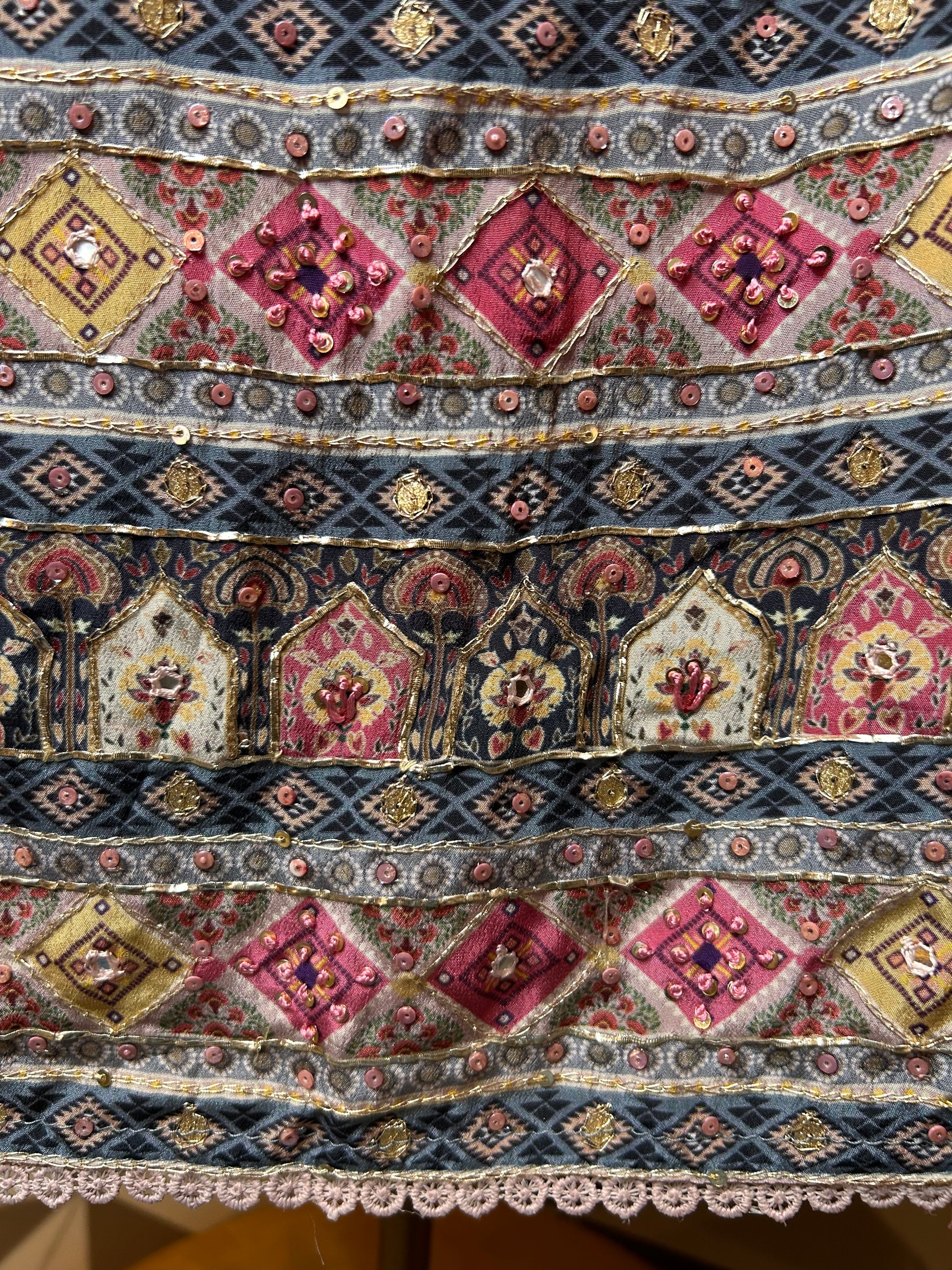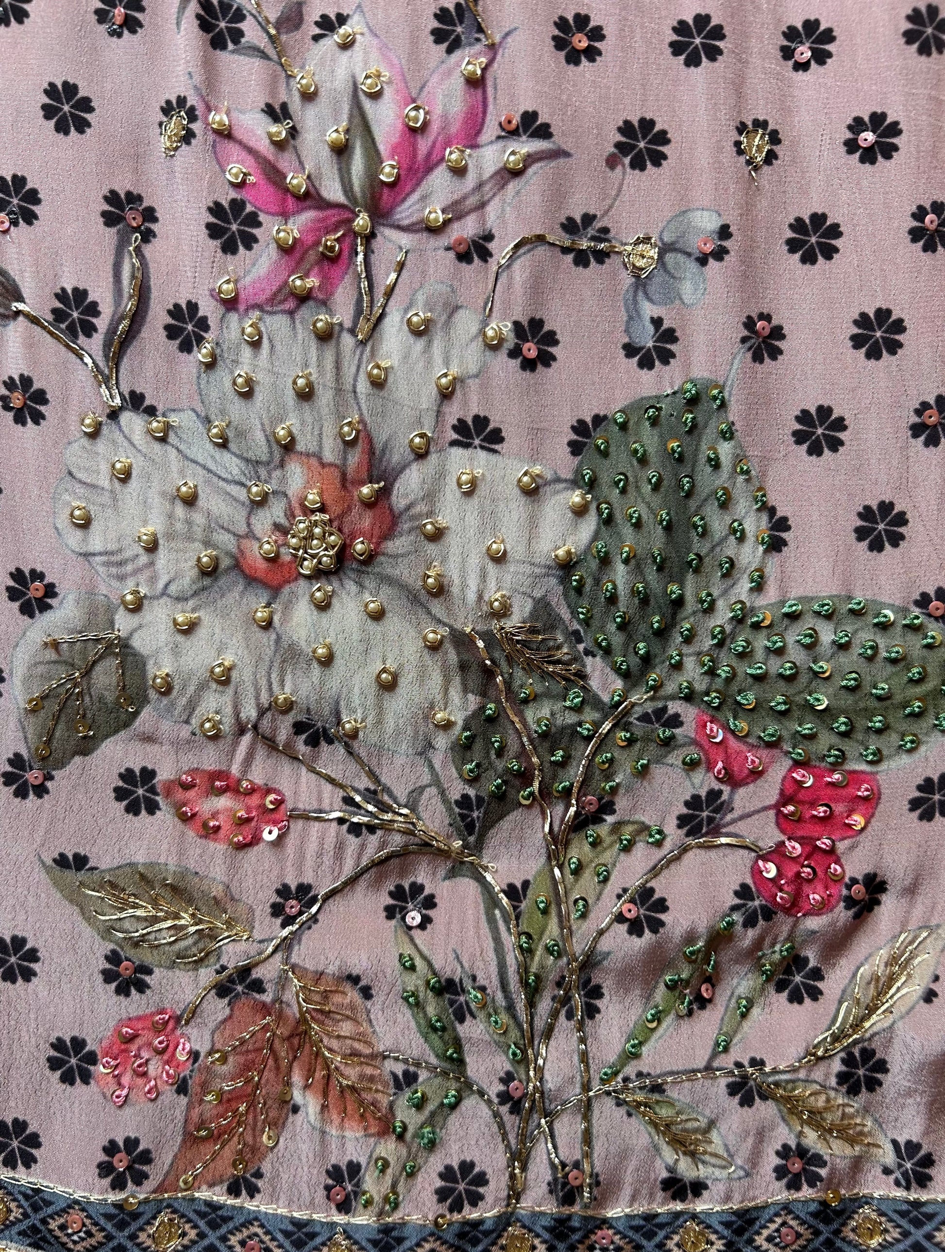 A refined crepe canvas brought to life with intricate hand embroidery, delicate moti accents, zari detailing, and Gehra work — perfect for both daytime sophistication and evening allure.