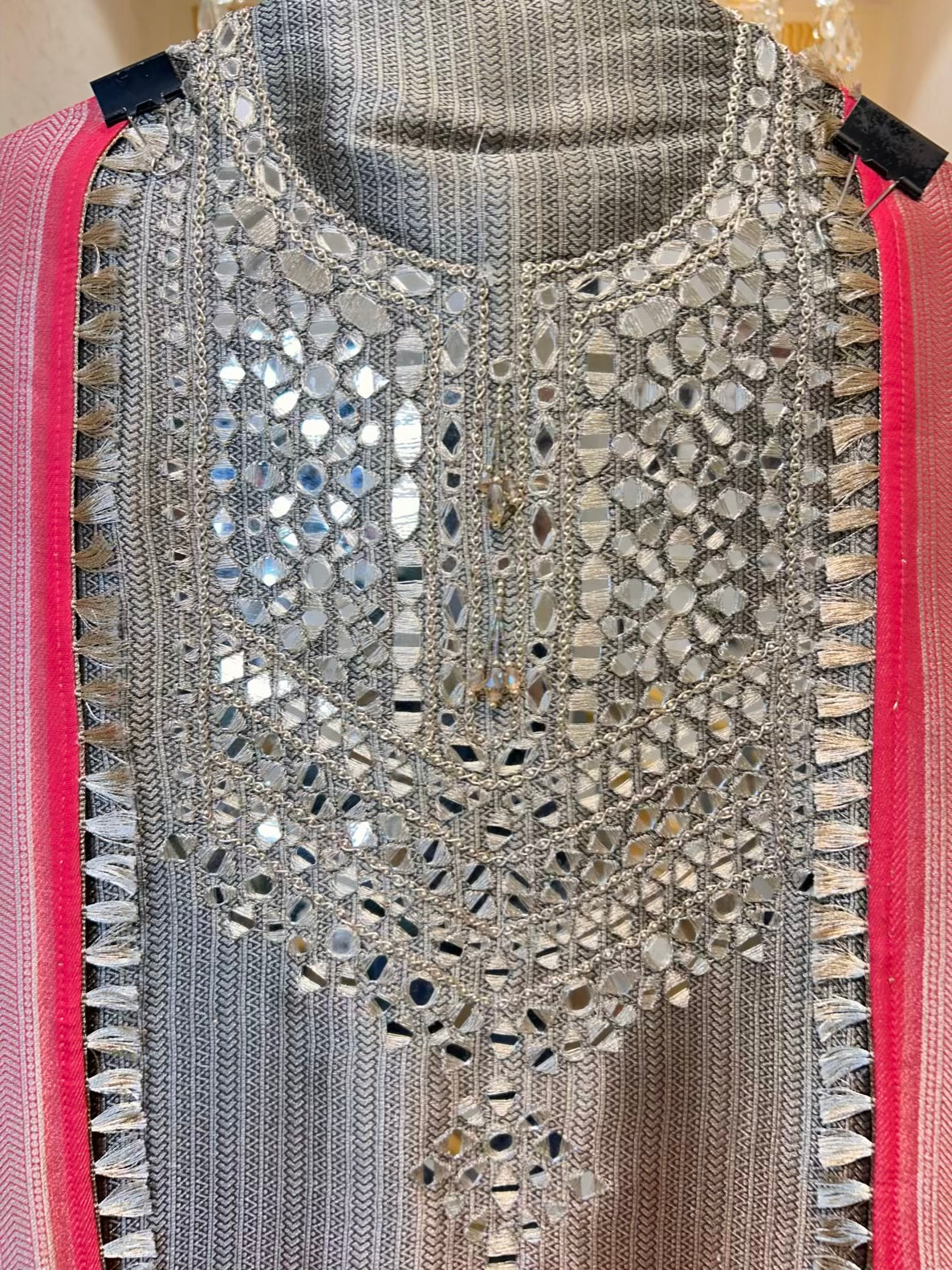 • Shimmer Organza Banarasi Brocade Suit (2.5 mtrs) – Accented with real mirror handwork on the neckline for a graceful statement.