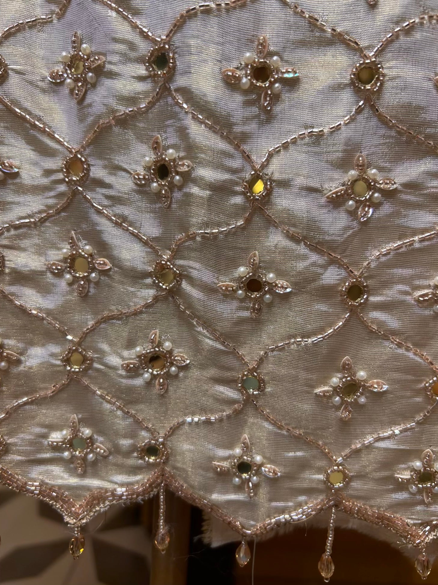 A masterpiece of craftsmanship, this Shimmer Organza suit with all-over handwork embodies grace and artistry in every detail. The intricate embroidery across the shirt creates a luxurious texture, while the shimmer organza dupatta adds a touch of ethereal charm. Completed with a silk bottom, the ensemble flows with sophistication—perfect for timeless festive elegance.