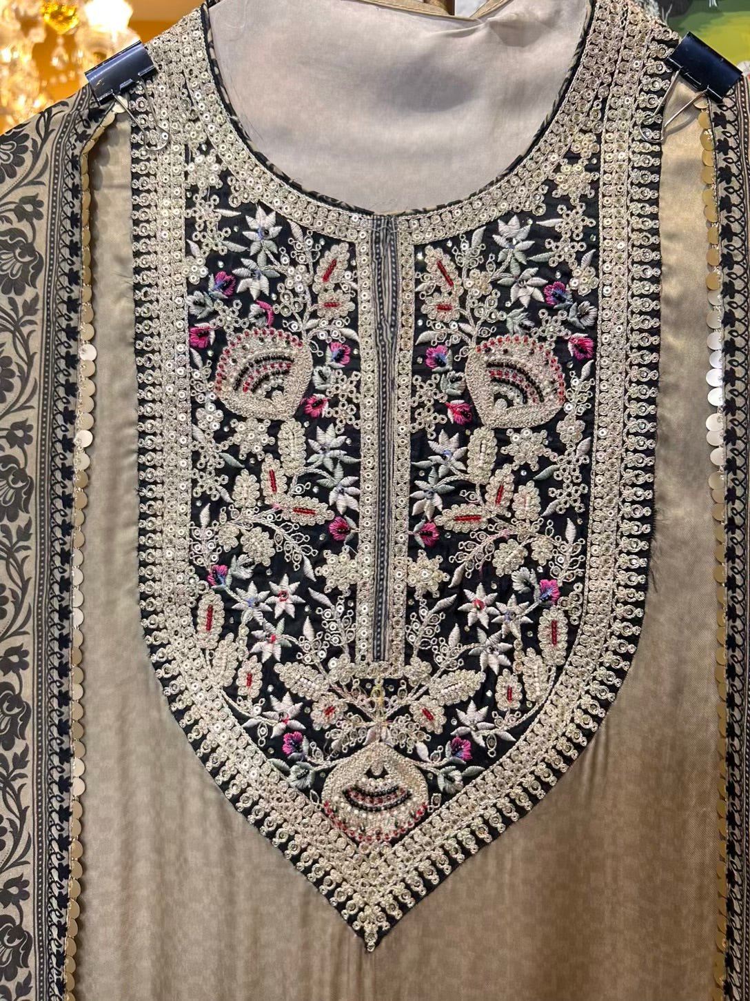 • Digital Printed Organza Suit (2.5 mtrs) – Enhanced with fine hand embroidery on the neckline for an artisanal touch.