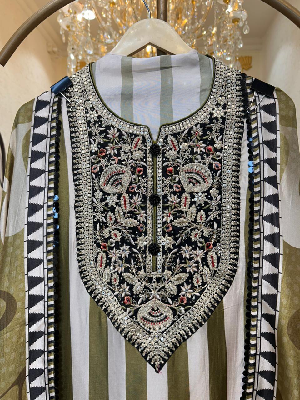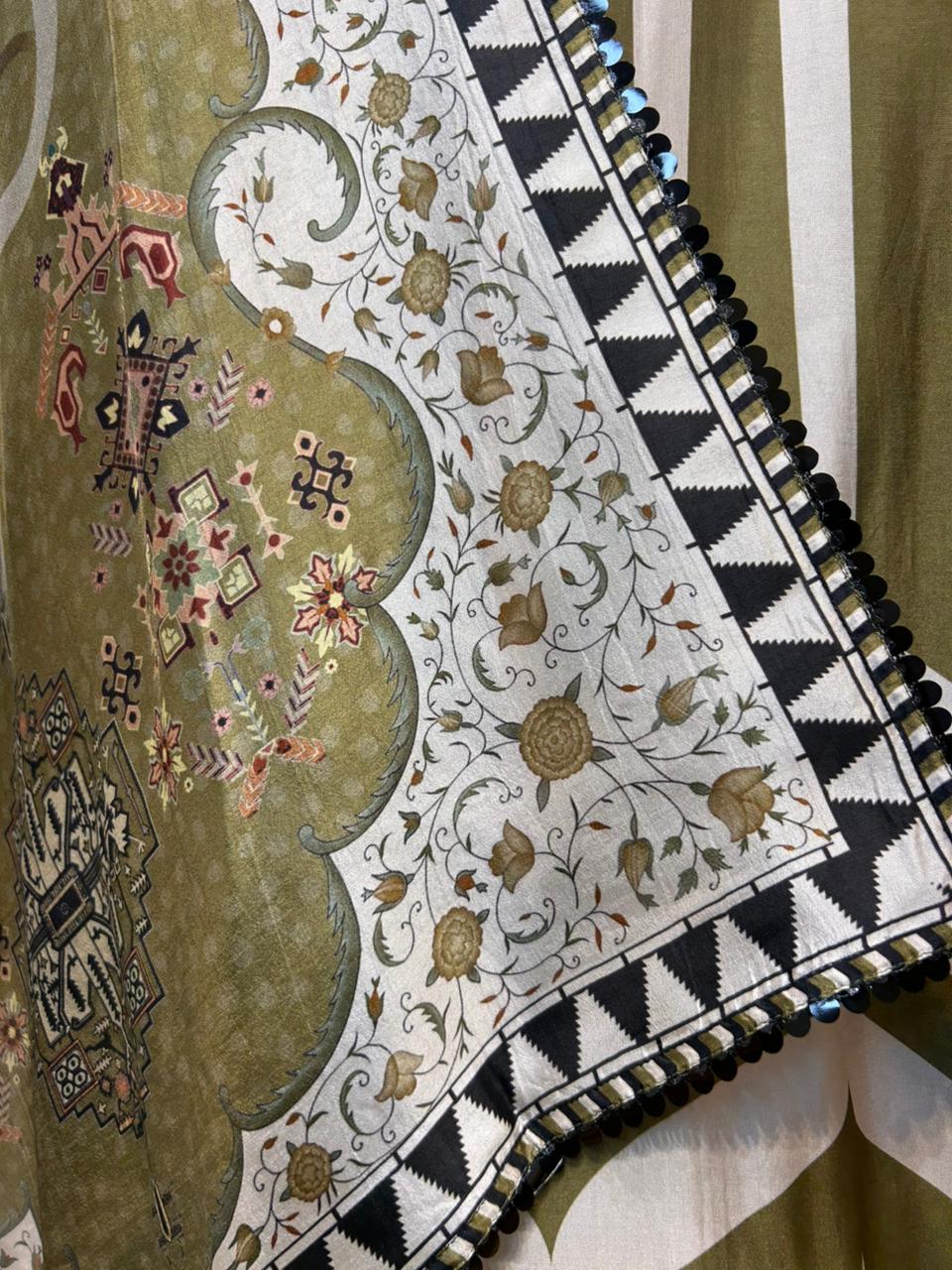 Paired with a digitally printed organza dupatta that lends lightness and visual contrast, and a smooth silk bottom for comfort and structure, this ensemble is designed for effortless sophistication — perfect for moments that call for quiet luxury.