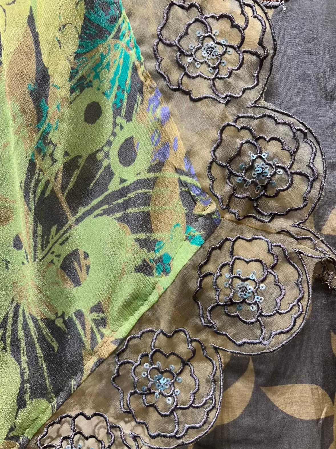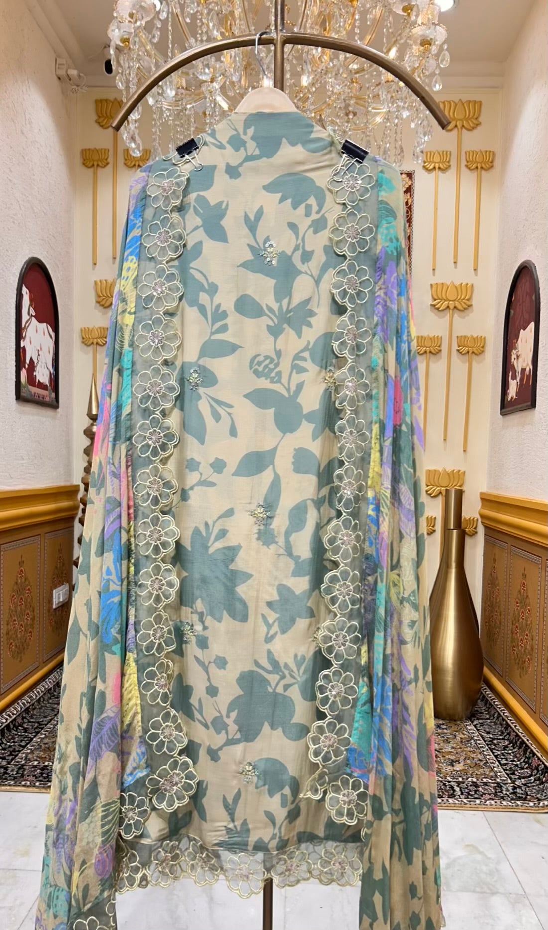 Paired with a flowing digital printed chinon dupatta, finished with a refined four-side organza cut border, the ensemble gains graceful movement and visual depth. A comfortable cotton shantoon bottom balances the look, making it ideal for long hours of wear without compromising on style.