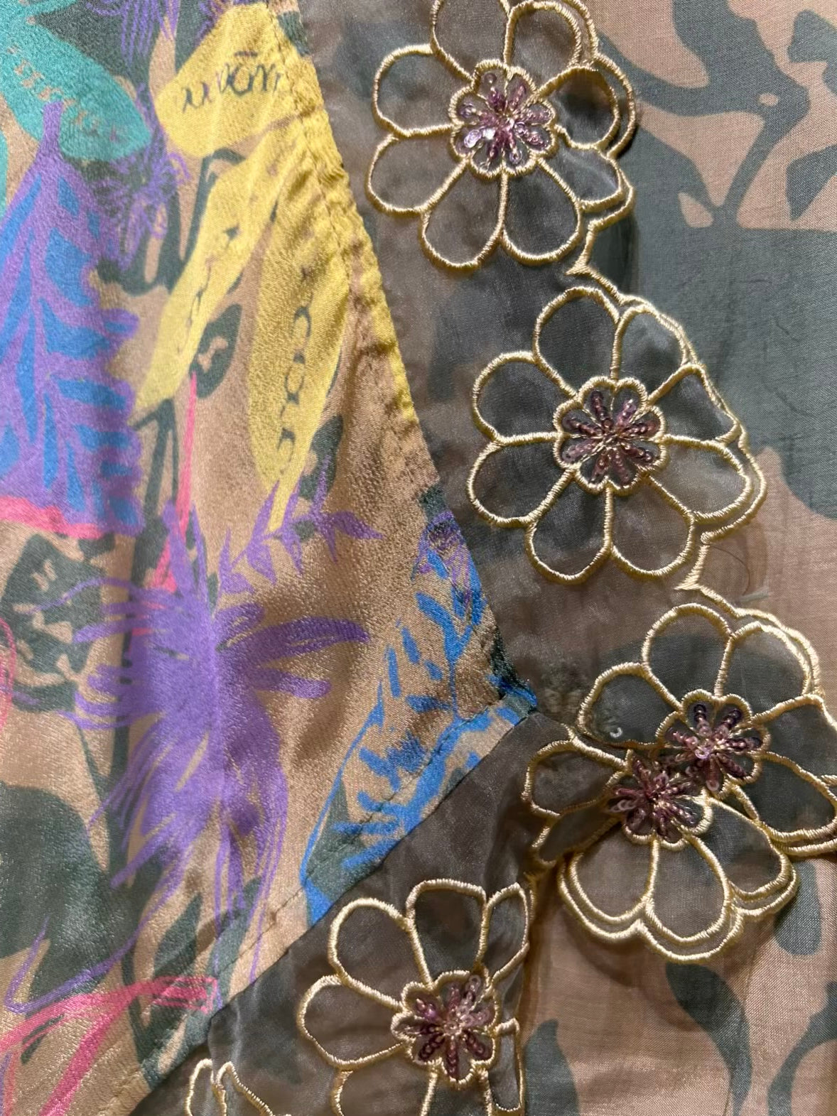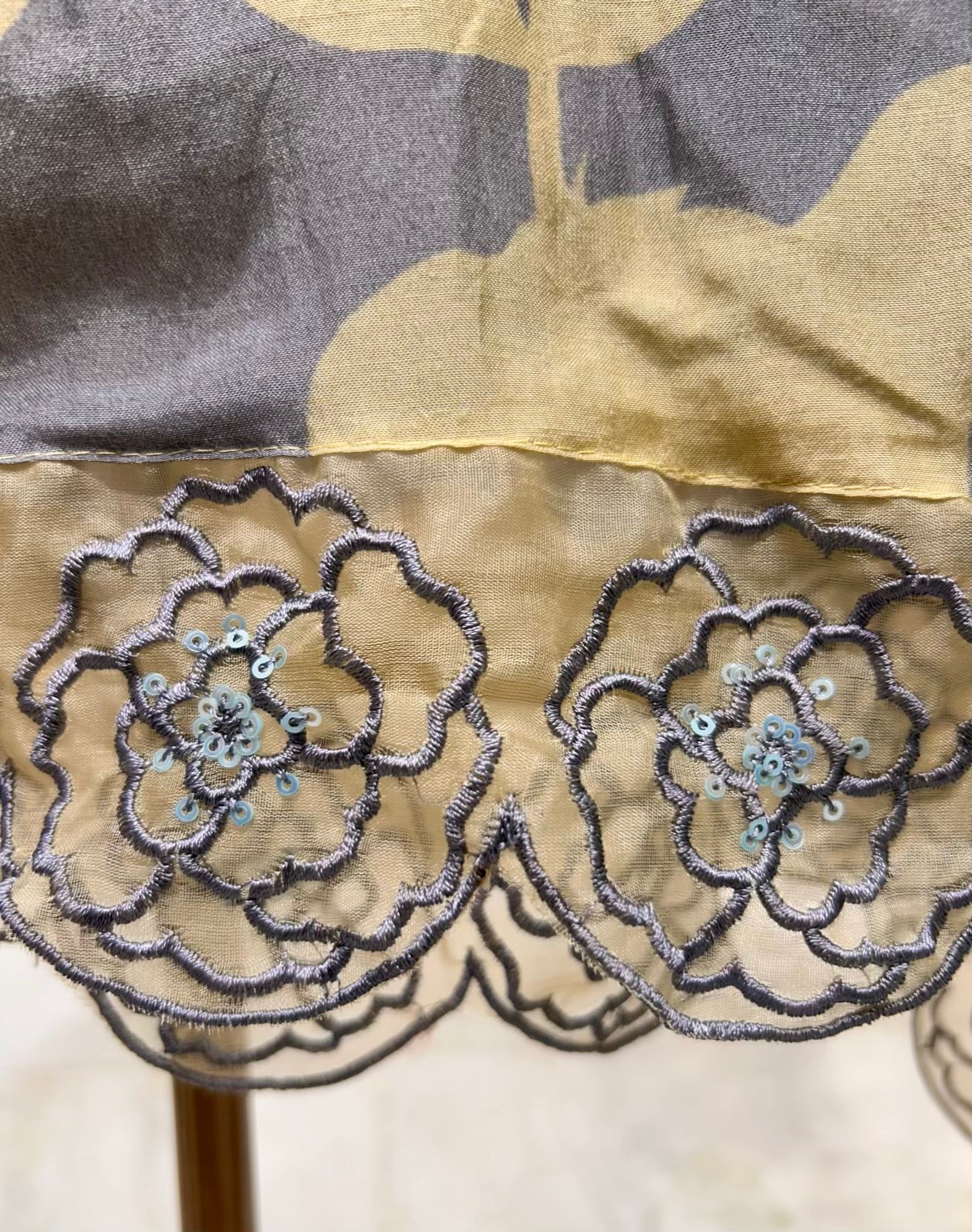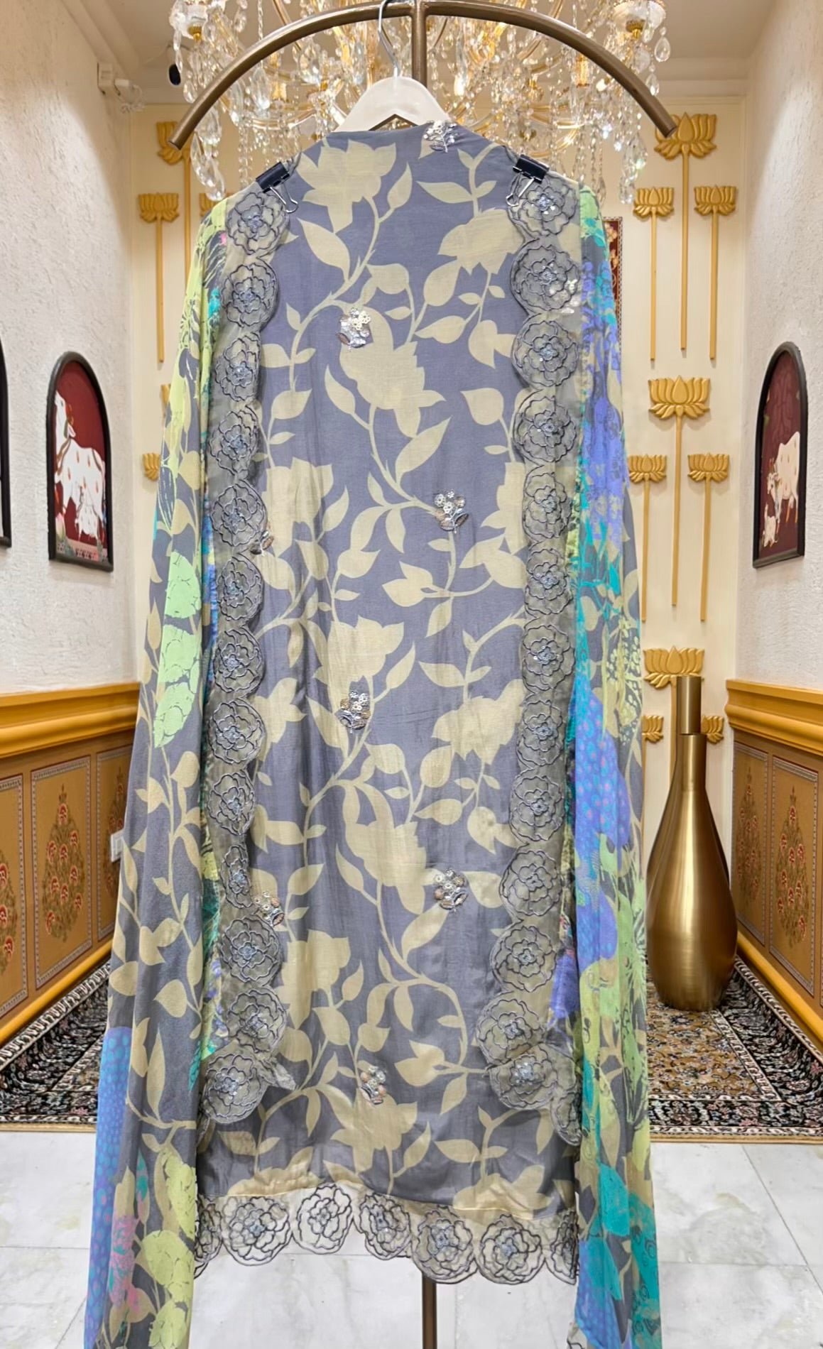 Paired with a flowing digital printed chinon dupatta, finished with a refined four-side organza cut border, the ensemble gains graceful movement and visual depth. A comfortable cotton shantoon bottom balances the look, making it ideal for long hours of wear without compromising on style.