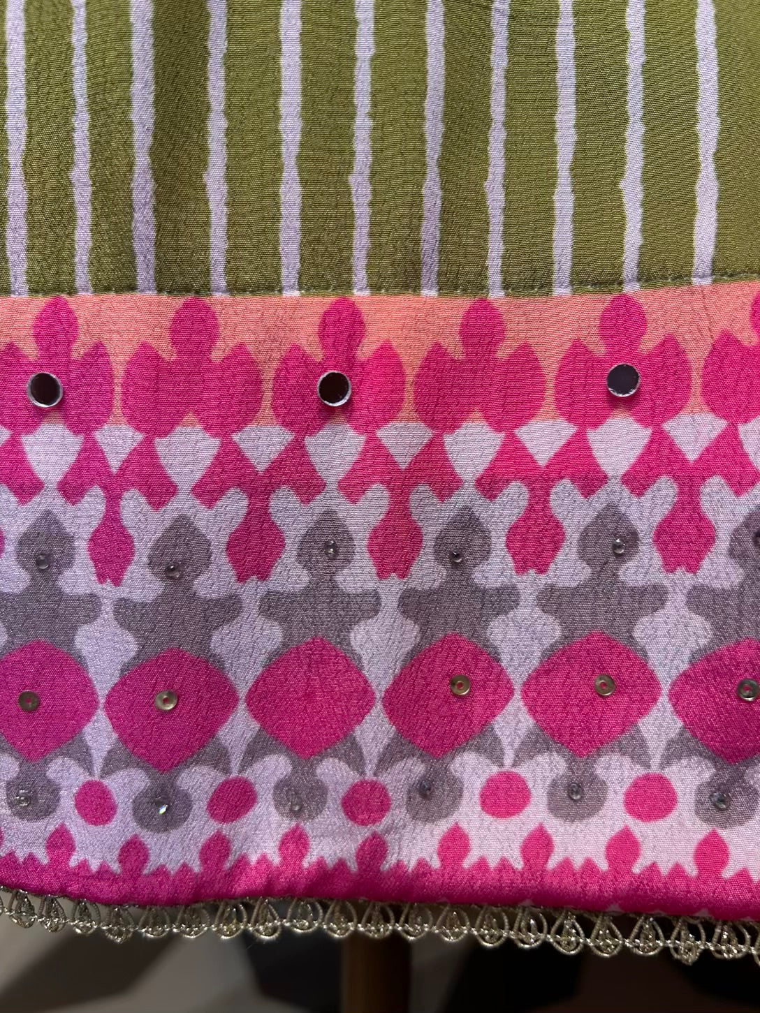 Elegant and effortlessly graceful — the Mehrunissa Crepe Suit blends contemporary finesse with traditional charm. The crepe suit, detailed with delicate Moti and gotta work along the neckline, adds a touch of subtle radiance without overwhelming the look. Paired with a soft silk bottom and a digitally printed crepe dupatta, this ensemble offers a beautiful balance of comfort, style, and artisanal detailing.