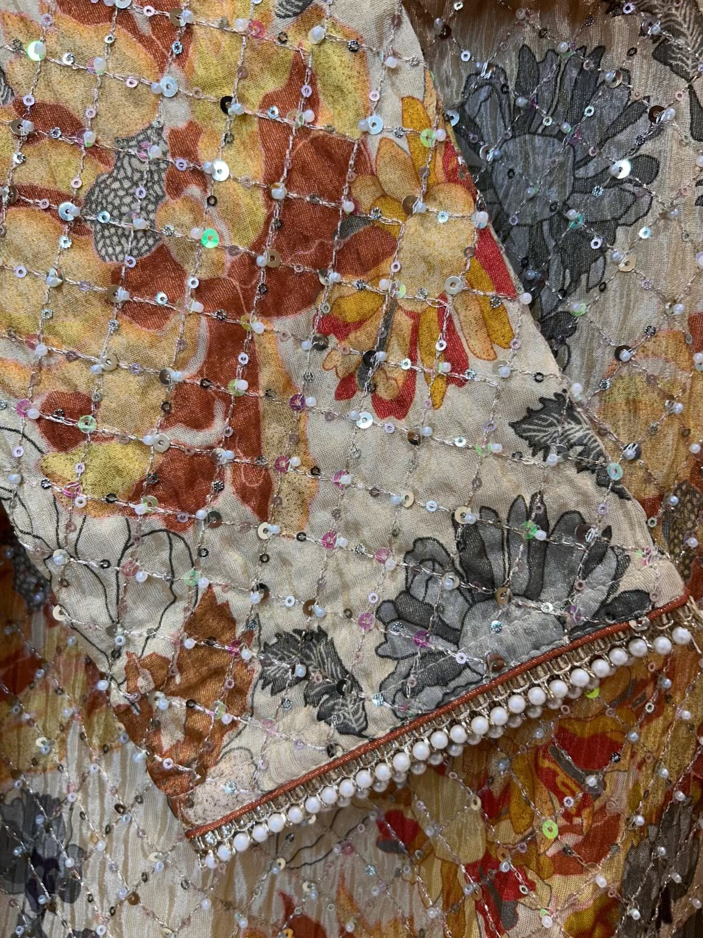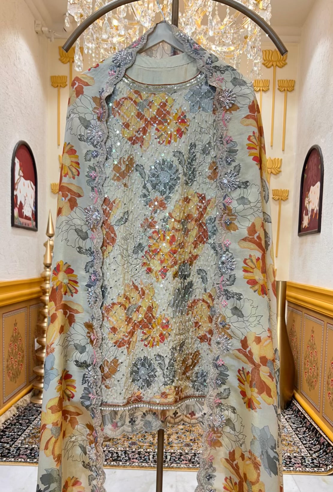 • Stitched Shimmer Organza Suit (Size 42) — Digitally printed and embellished with sequins handwork for a luminous festive finish.