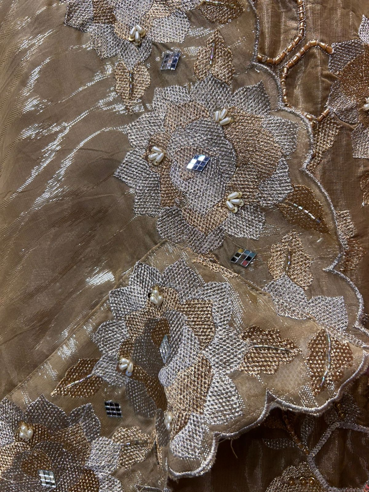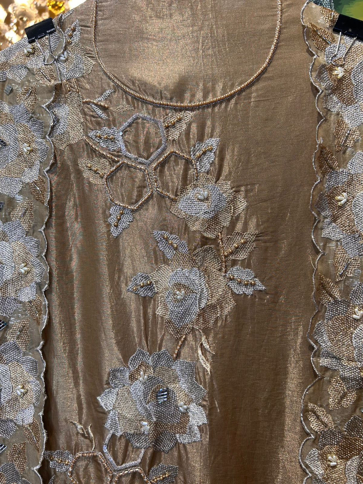 • Shimmer Organza Shirt (2.5 mtrs) – Handcrafted with zari and moti work for a luminous, elegant appeal.