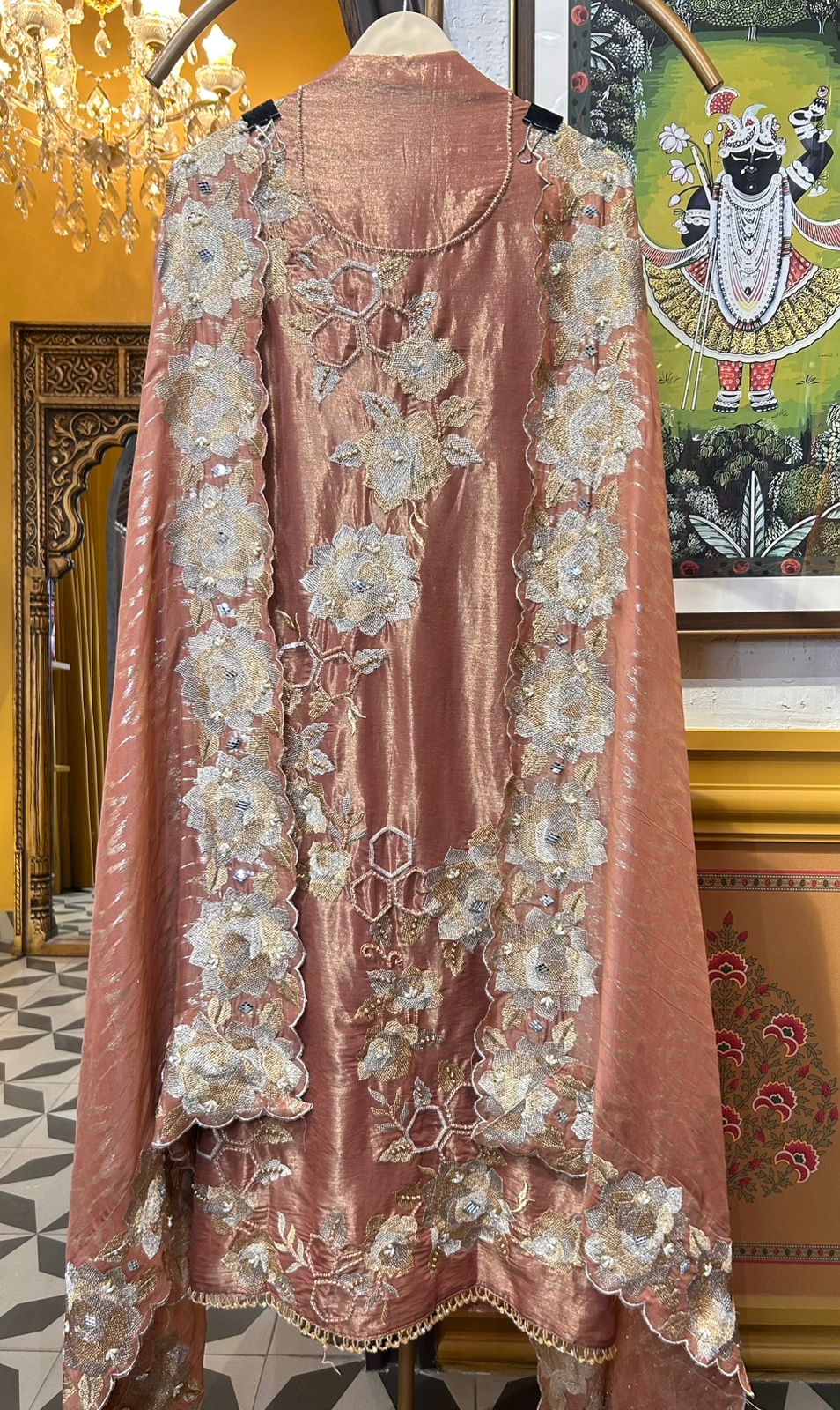 A symphony of shimmer, grace, and artistry — the Naaz-é-Zariya Suit captures the essence of timeless elegance. Crafted in ethereal shimmer organza, the suit features exquisite zari and moti work, weaving together threads of tradition and radiance. Each motif glimmers with a touch of understated opulence, creating a look that feels both regal and refined.