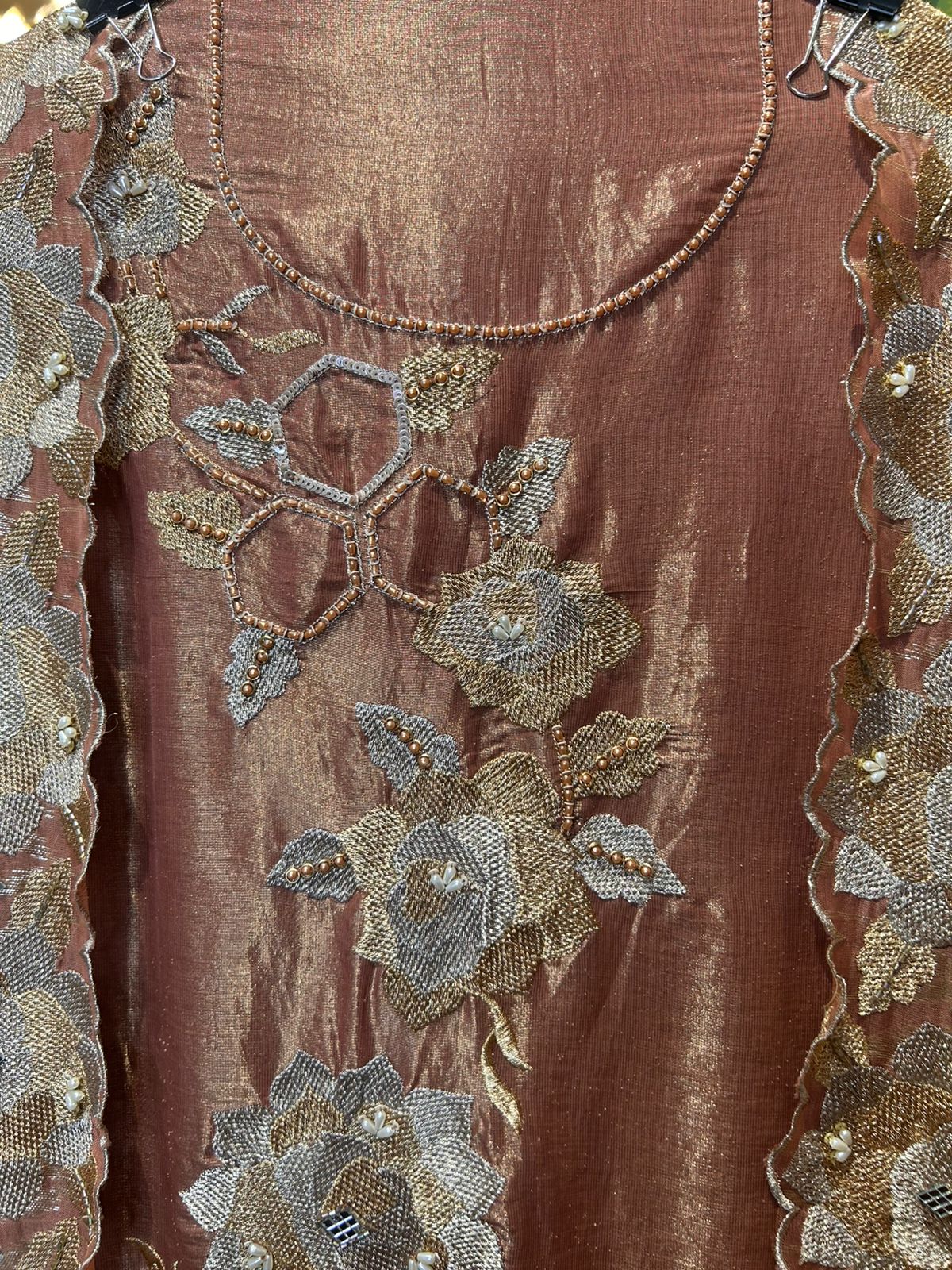 • Shimmer Organza Shirt (2.5 mtrs) – Handcrafted with zari and moti work for a luminous, elegant appeal.