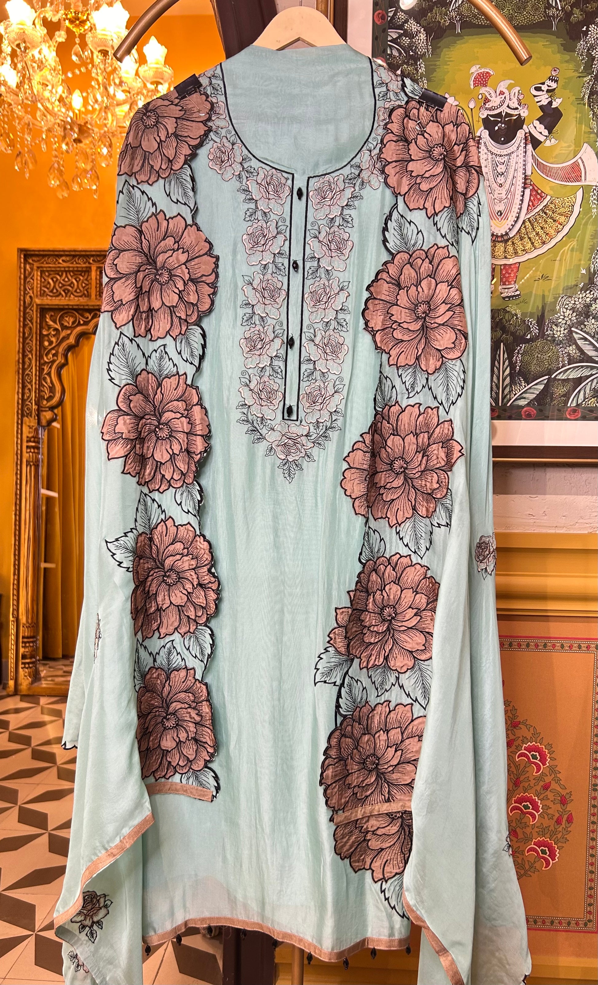 A lightweight drape finished with appliqué motifs, balancing grace with a hint of artistry.