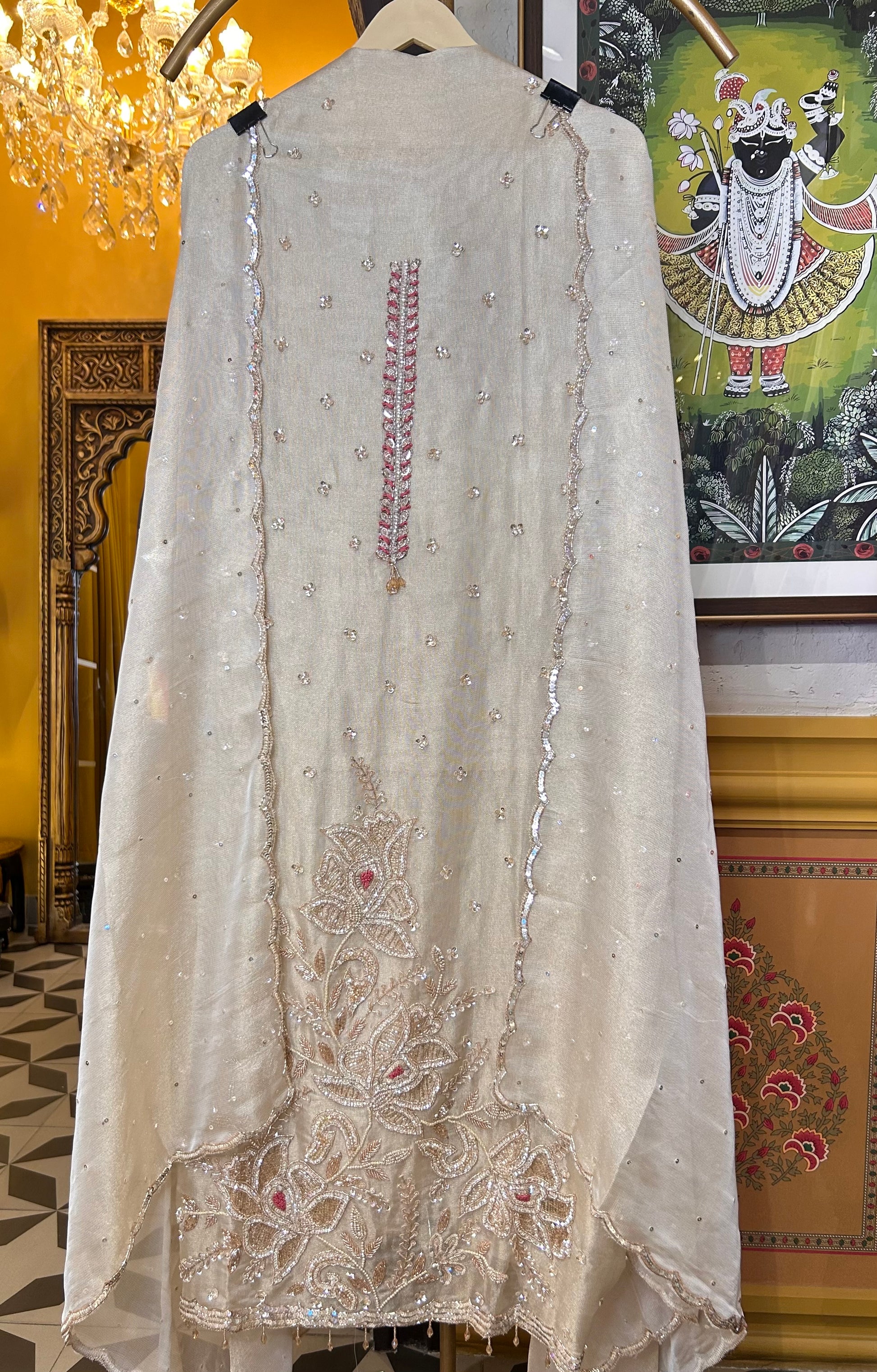 The Naqsh-e-Noor Set embodies timeless charm—hand-embroidered shimmer organza brought to life with intricate ghera detailing and a dupatta edged in ornate cutwork.