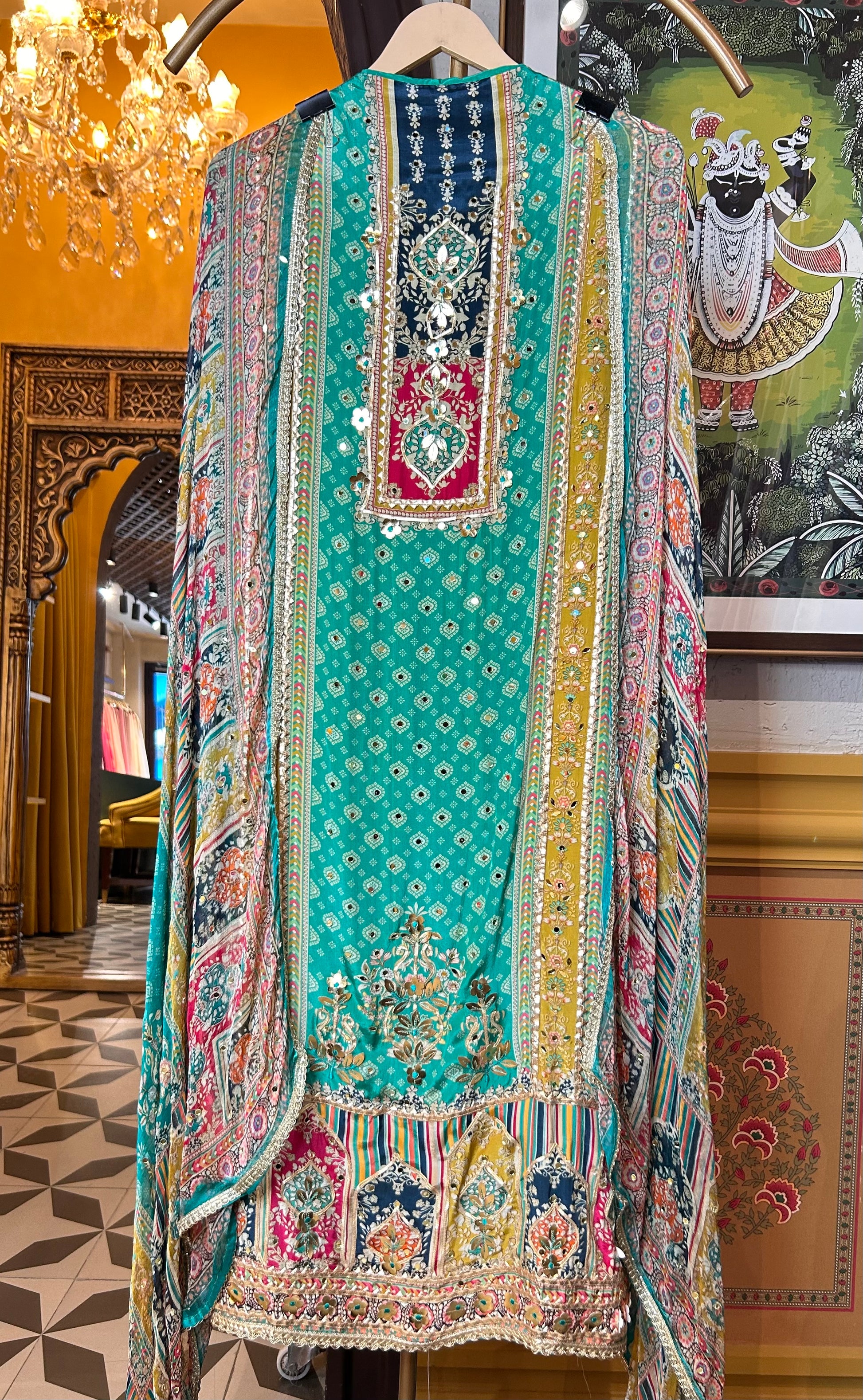 The Naureen Suit Set brings together soft digital prints with classic gota patti detailing — perfect for understated festive flair or intimate celebrations.