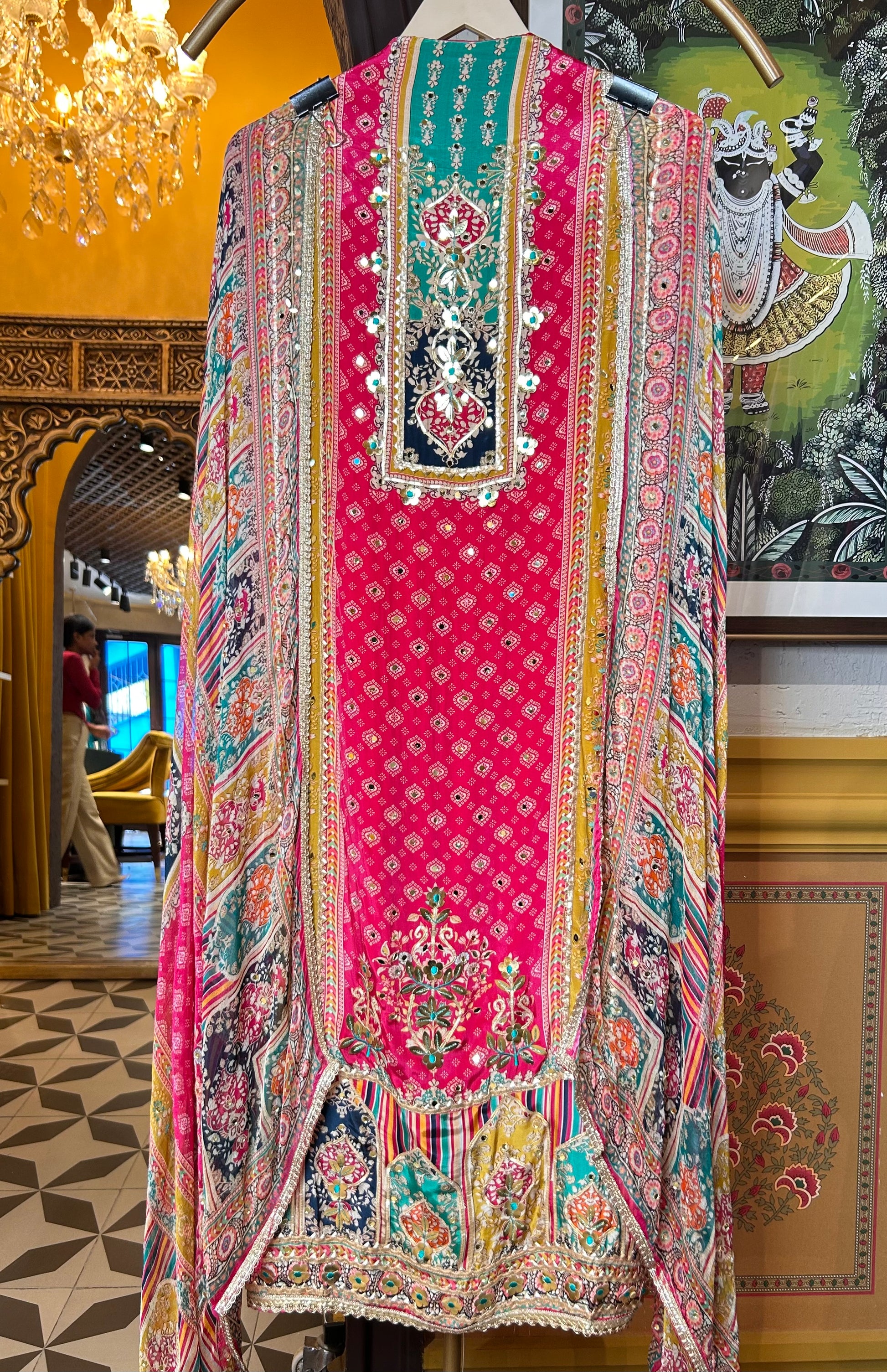 The Naureen Suit Set brings together soft digital prints with classic gota patti detailing — perfect for understated festive flair or intimate celebrations.