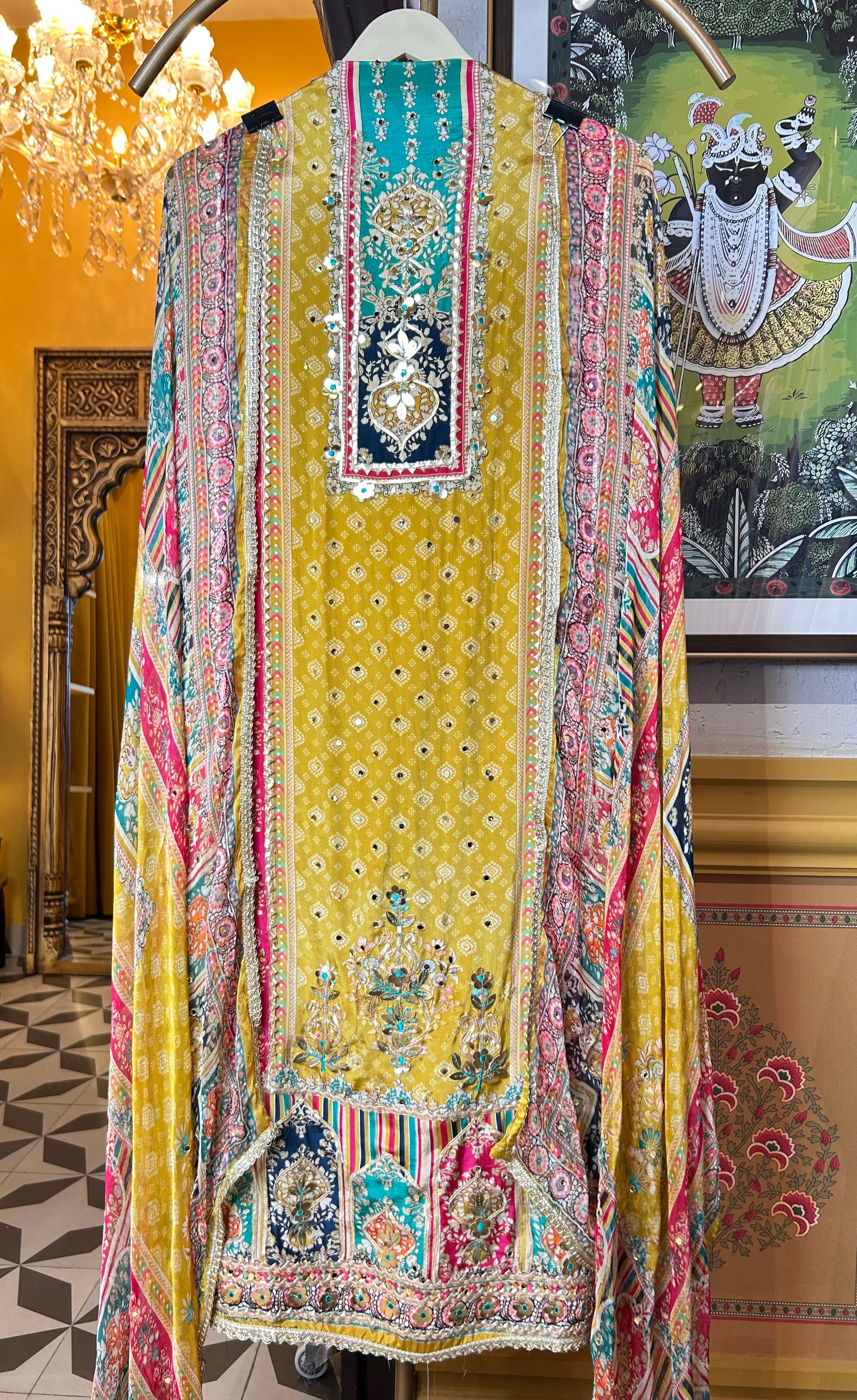 The Naureen Suit Set brings together soft digital prints with classic gota patti detailing — perfect for understated festive flair or intimate celebrations.
