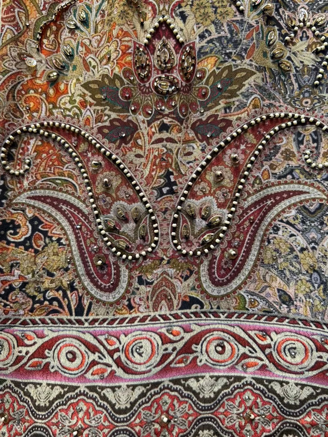 Soft, contemporary, and effortlessly elegant — the Nayesha Crepe Suit brings together the comfort of crepe with the charm of delicate craftsmanship. The digitally printed crepe suit is enhanced with refined handwork, adding a subtle sparkle that elevates its modern aesthetic. Paired with a flowing pure Chinon dupatta featuring coordinated digital prints and a smooth silk bottom, this ensemble blends ease, artistry, and timeless beauty.
