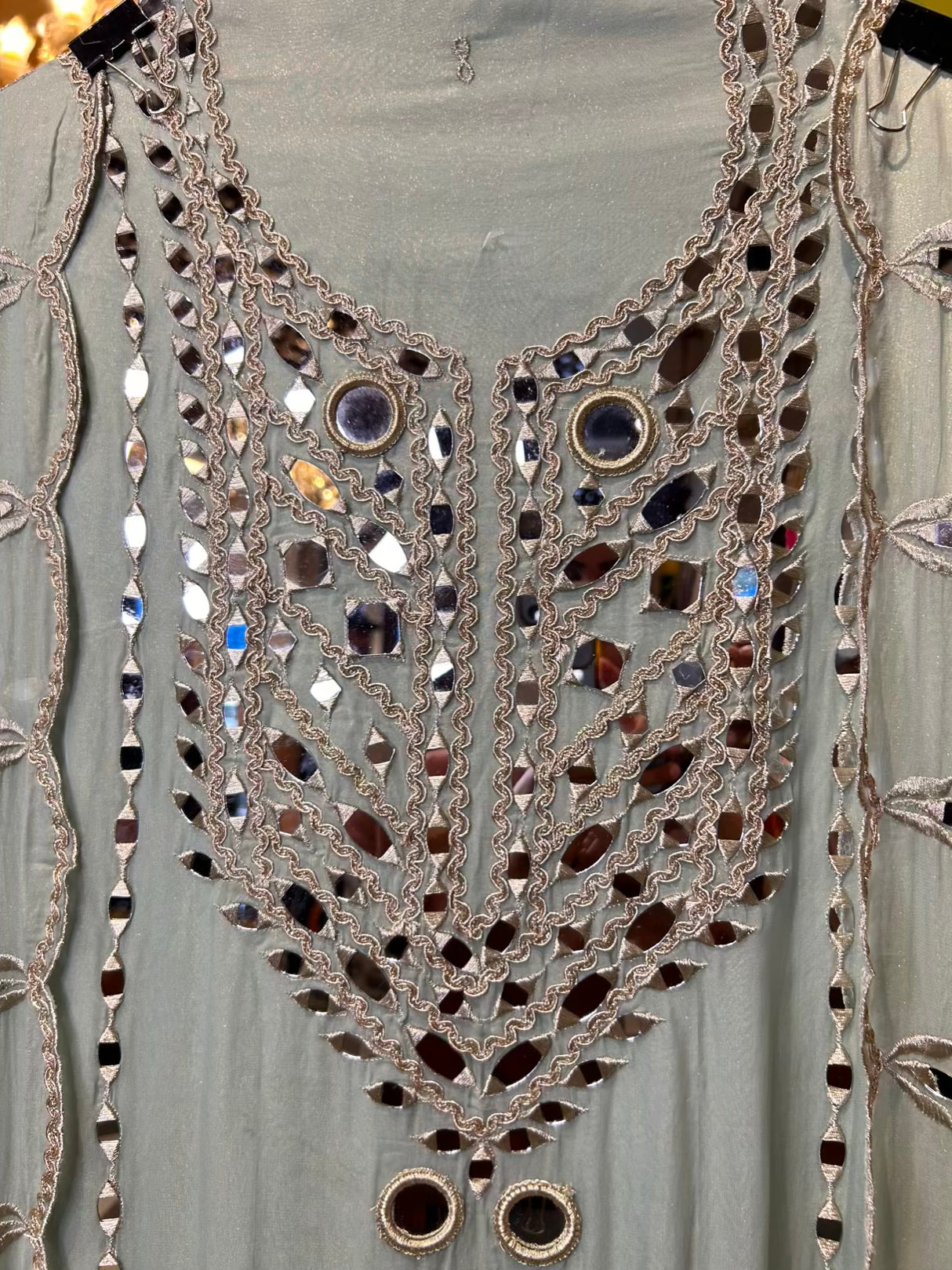 • Organza Suit (2.5 mtrs) – Handcrafted with real mirror and dori work that reflects refined artistry.
