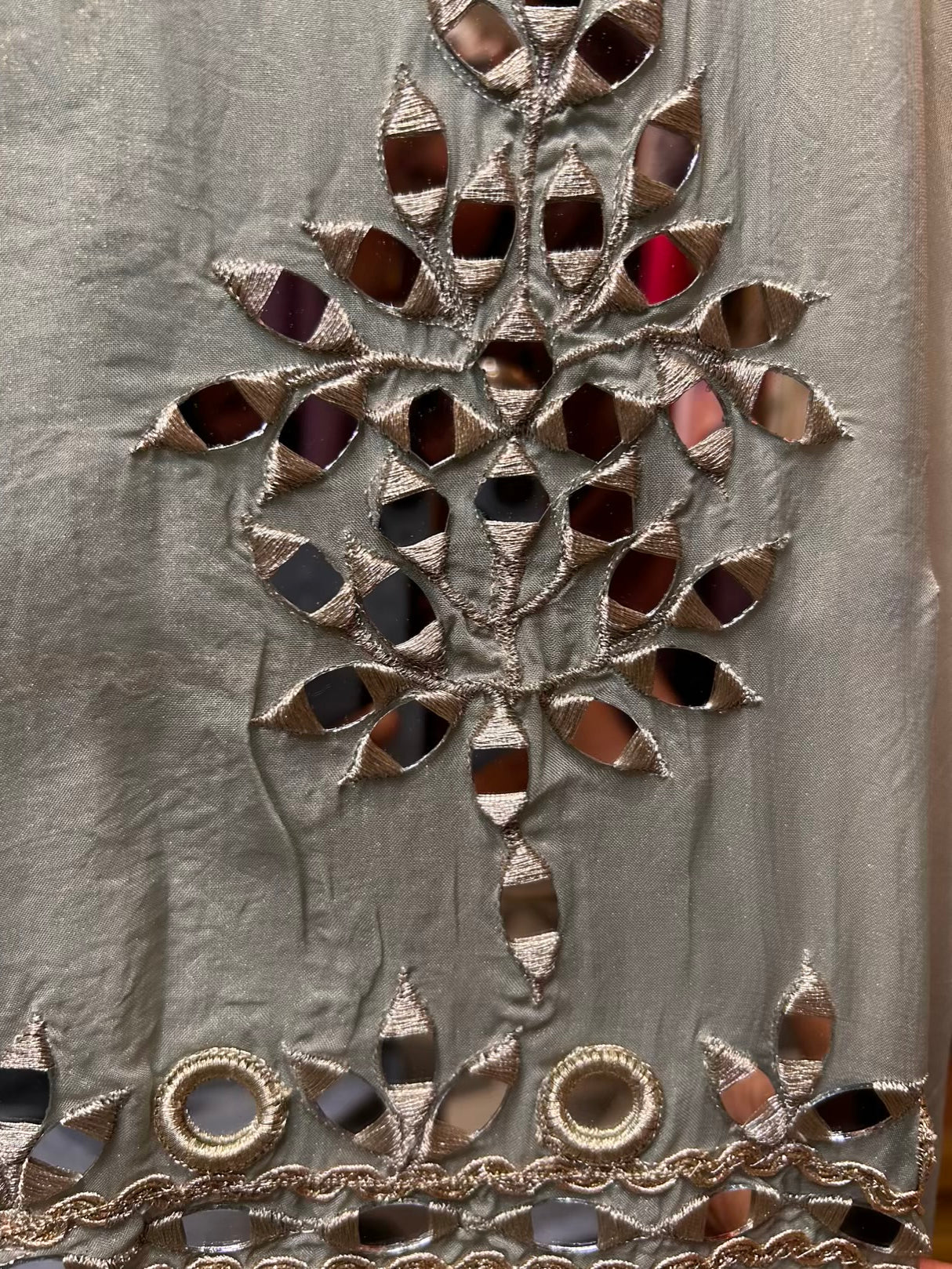 • Organza Dupatta (2.25 mtrs) – Embellished with mirror work for a subtle, radiant allure.