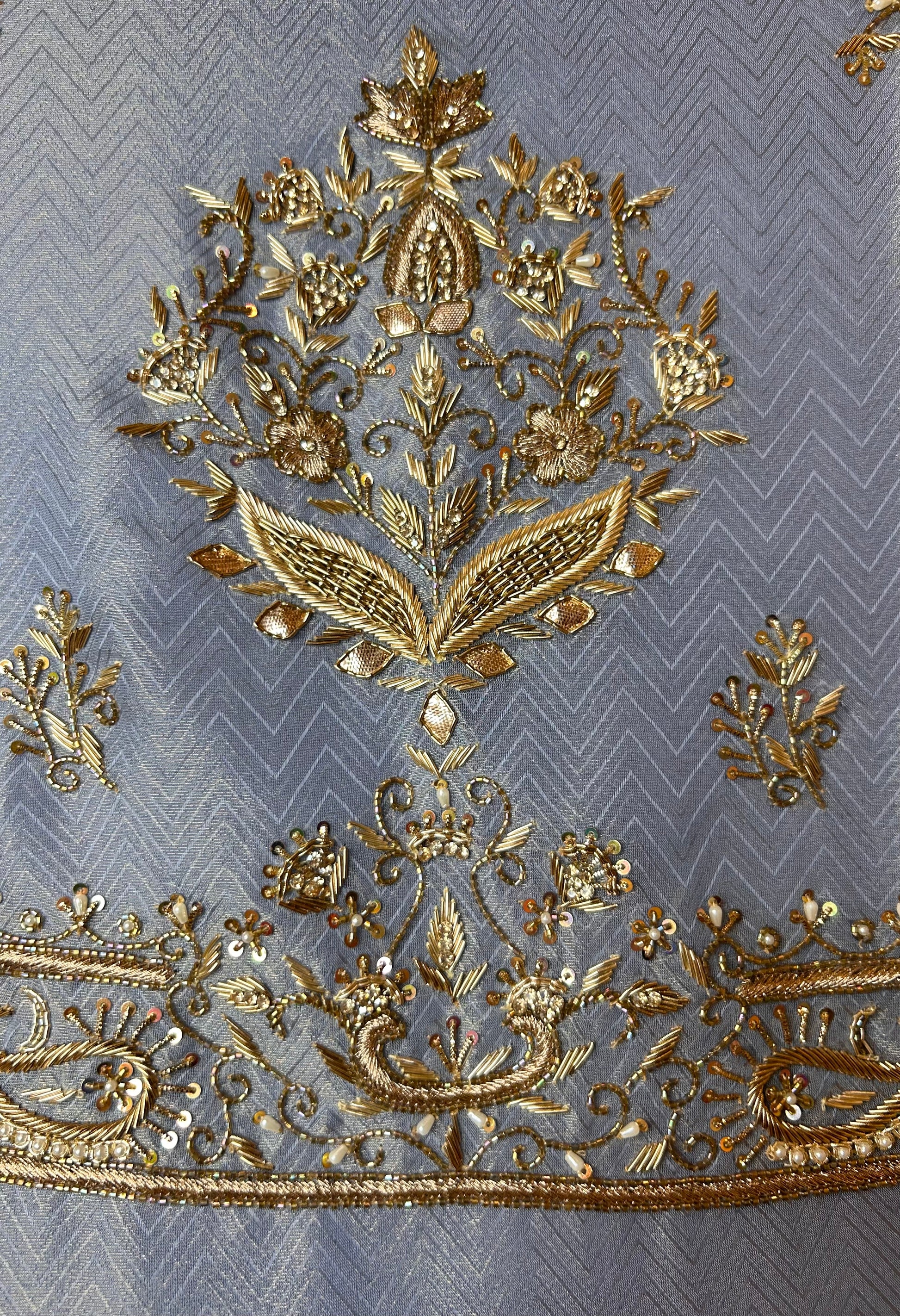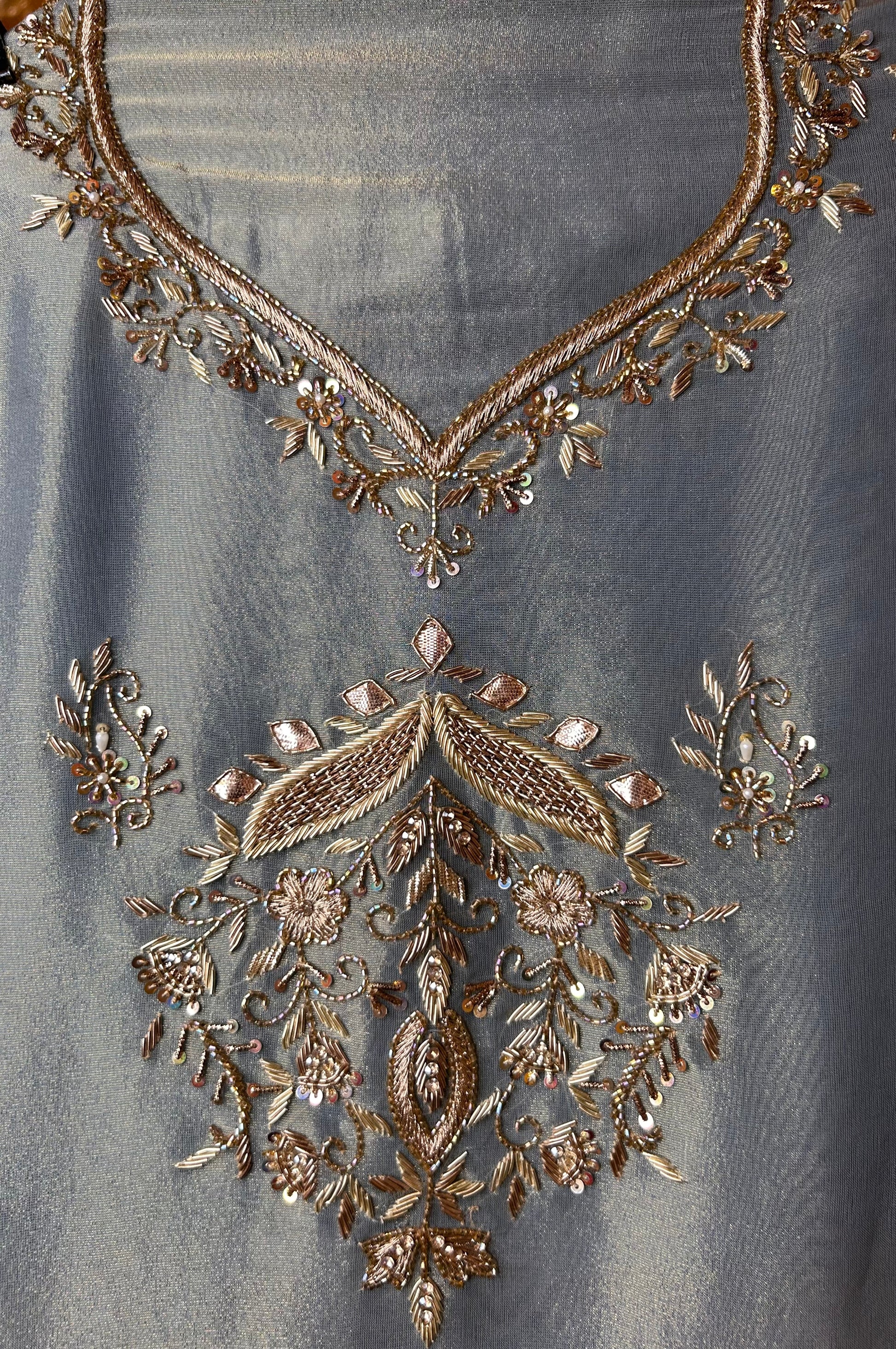 - Shimmer Organza Shirt – adorned with intricate dabka work (2.5m)