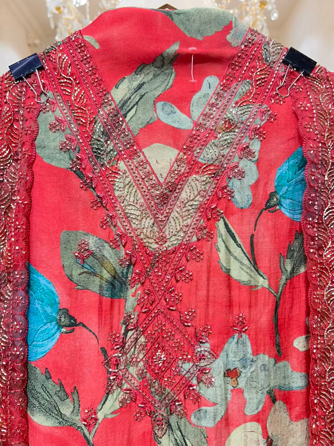 • Digital Printed Dupatta with Organza Border (2.25 mtrs) – Finished with four-side organza edging and delicate handwork for an elevated finish.